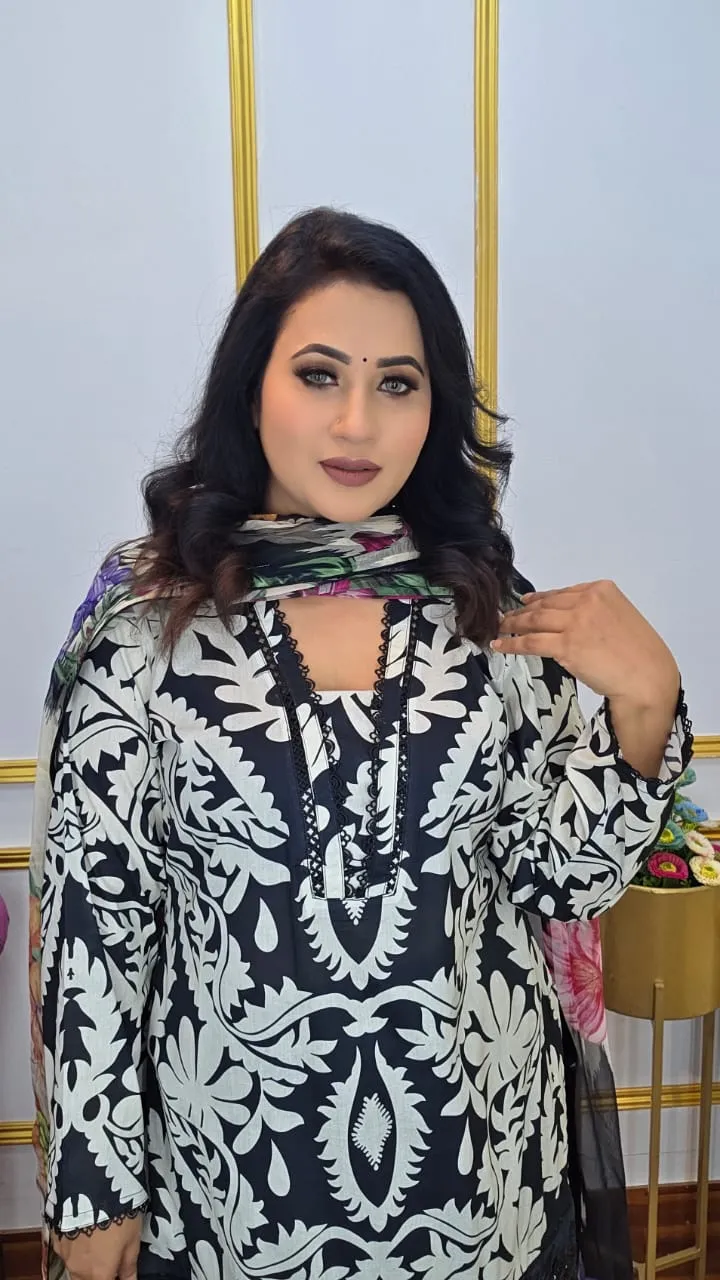 Upgrade your wardrobe with this Luxury Cotton Unstitched Three Piece Set, designed for elegance and comfort. Featuring vibrant digital prints on the body and orna, extra embroidery pieces, and a soft chiffon orna, this set allows you to create a perfectly tailored outfit with a graceful, boutique-style finish. Ideal for festive occasions, casual gatherings, or any event where sophistication matters.