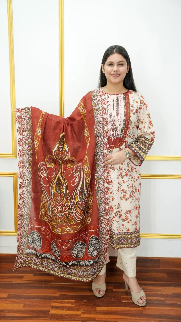 Upgrade your wardrobe with this stylish and comfortable premium cotton 3-piece set. Featuring elegant embroidery, vibrant digital prints on the body and orna, and a soft chickenkurry pant, it’s perfect for casual gatherings, festive occasions, or everyday chic styling. Free size fits most body types effortlessly.
