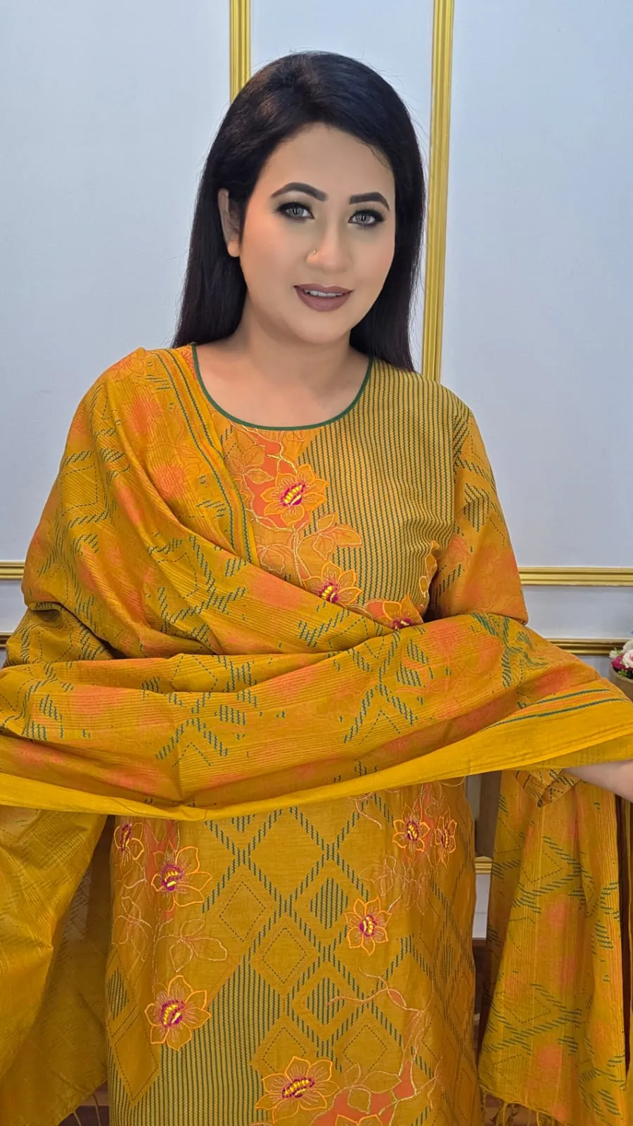 Embrace ethnic elegance with this Butiks Ready Three-Piece Set, crafted from soft pure cotton fabric for comfort and style. Featuring all-over geometric and ethnic block prints and vibrant multicolor embroidery on the front panel, this set is perfect for festive occasions and casual outings. The tassel work dupatta adds a charming finishing touch. Available in sizes 36–46 with a length of 42+ inches.