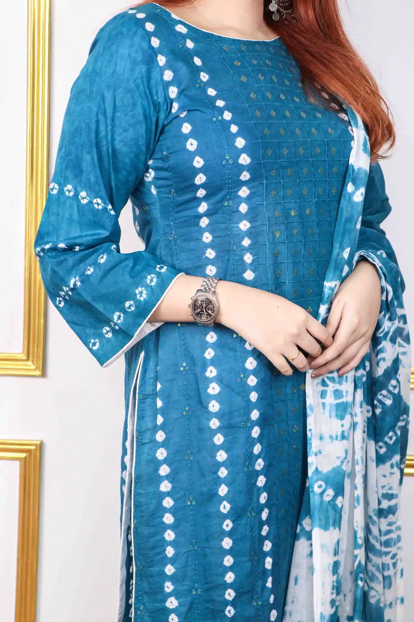 This Chundri Batik Unstitched Three Piece Set, made from soft and breathable cotton fabric for all-day comfort. Featuring classic Chundri batik design with delicate sequence work, this outfit is perfect for women looking for a graceful yet comfortable style. Designed for body size 70+ with a 42+ inch length, it offers ample fabric for easy custom stitching—ideal for casual wear and festive occasions.