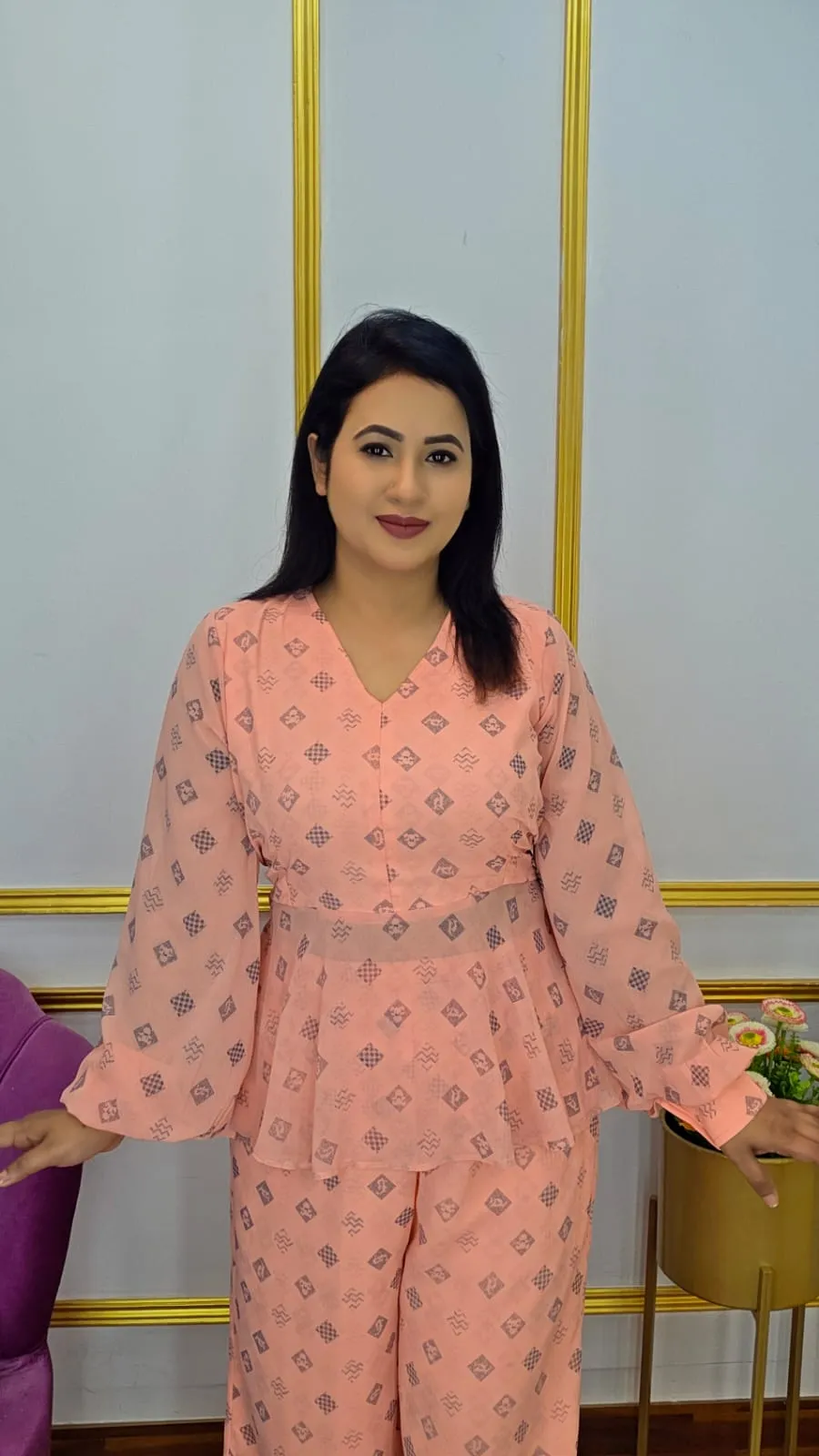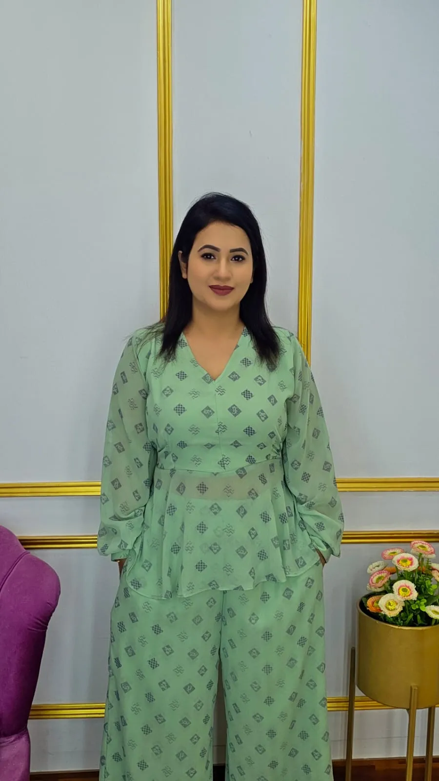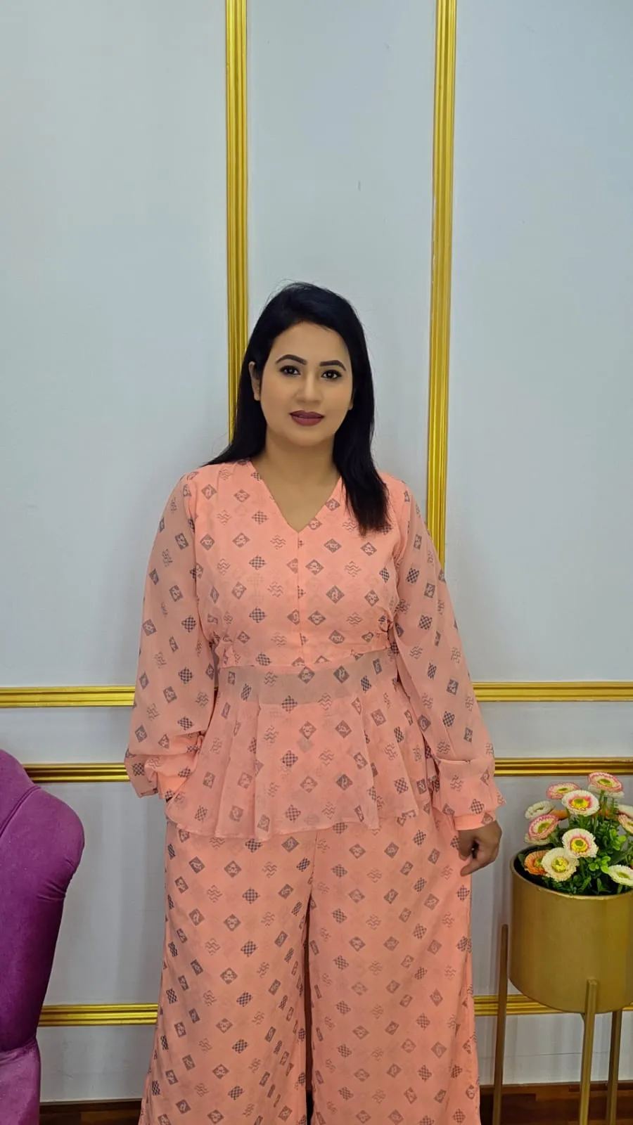 This Designer Two-Piece Set will elevate your wardrobe because it is made of high-quality georgette fabric, which feels smooth, light, and flowy. This ensemble combines contemporary style with everyday comfort, making it ideal for informal get-togethers, parties, or business attire.