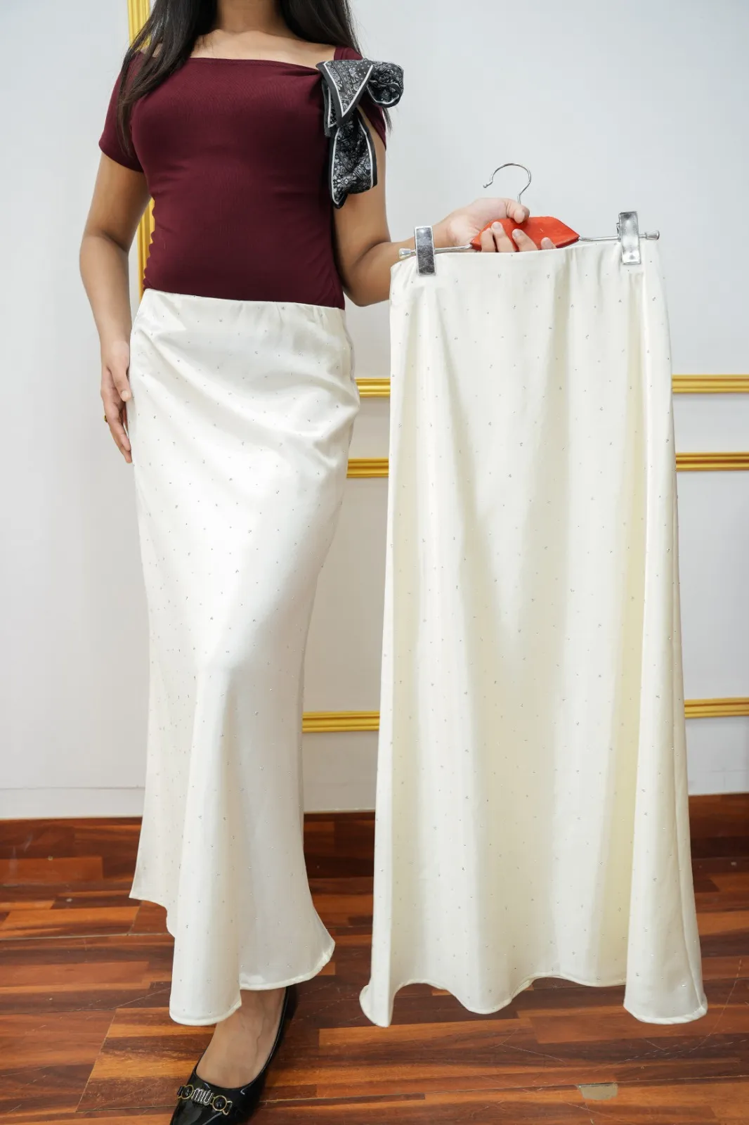 This stylish Imported Thai Long Skirt. Designed for comfort and modern fashion, the skirt features a flexible waist measurement from 24 to 32 inches, ensuring a comfortable and adjustable fit.