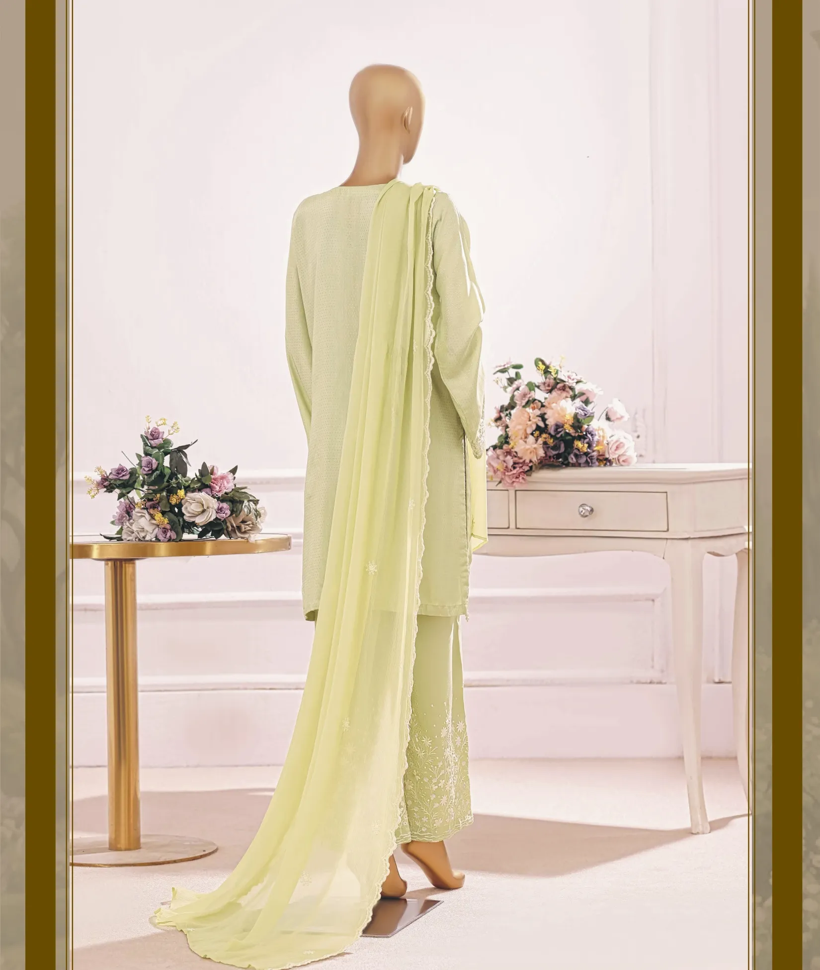 The dress's elaborate embroidery adds a delicate yet fashionable touch. A lightweight chiffon dupatta that creates a flowing silhouette and elegant drape complements it. For every special occasion, this ensemble guarantees a stylish and carefree appearance.