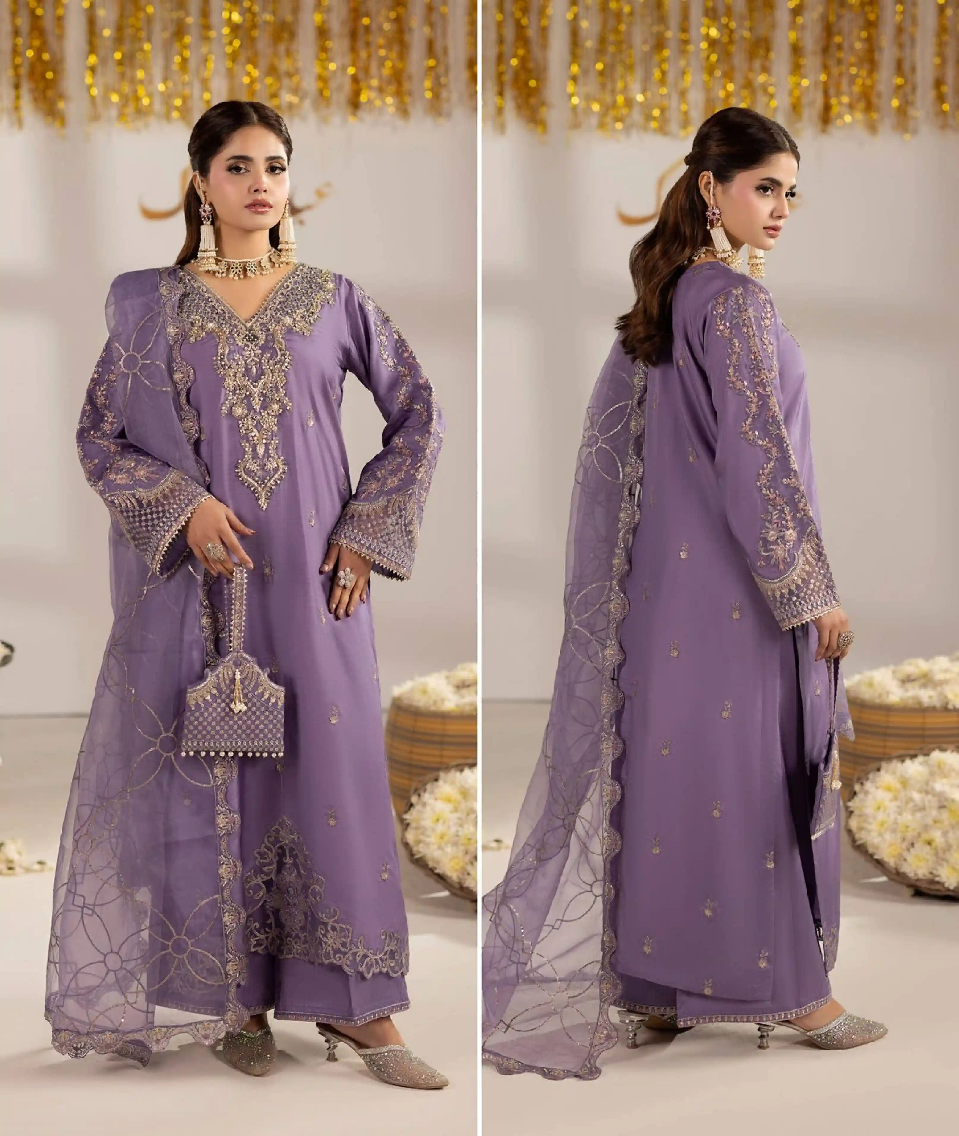 This elegant Pakistani 3-Piece Set, crafted from premium raw silk and organza fabrics for a luxurious and graceful look. Perfect for weddings, parties, and special occasions, this outfit blends tradition with modern sophistication.