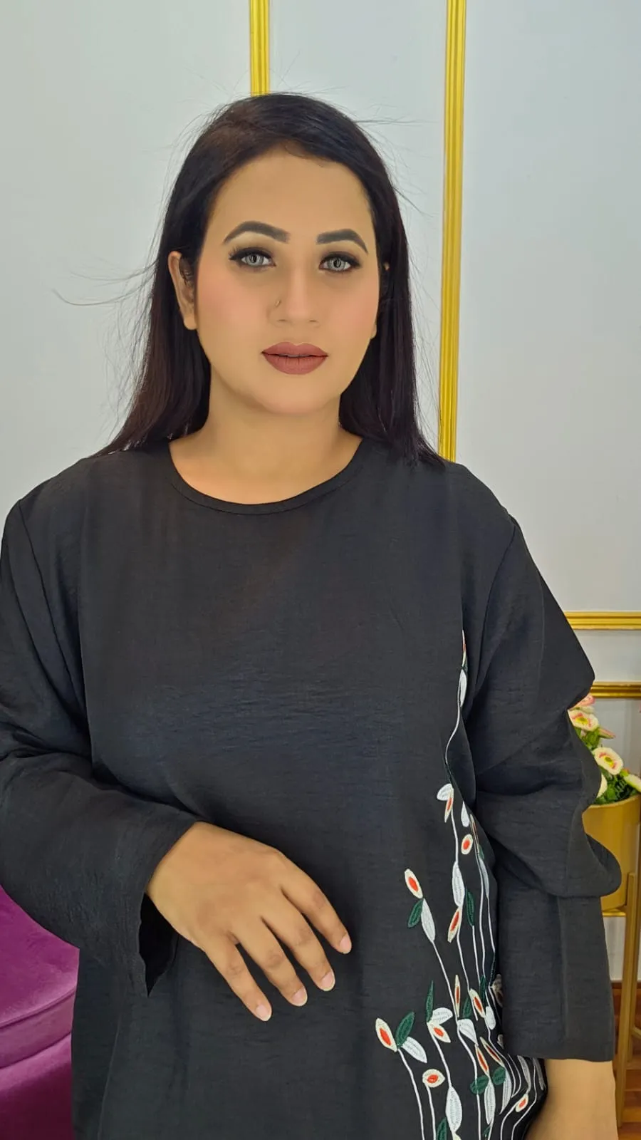The set features beautiful embroidery work that adds a refined and fashionable touch, making it suitable for casual outings, office wear, or small gatherings. With a free-size body fit up to 46, it ensures a comfortable and flattering look for different body types.