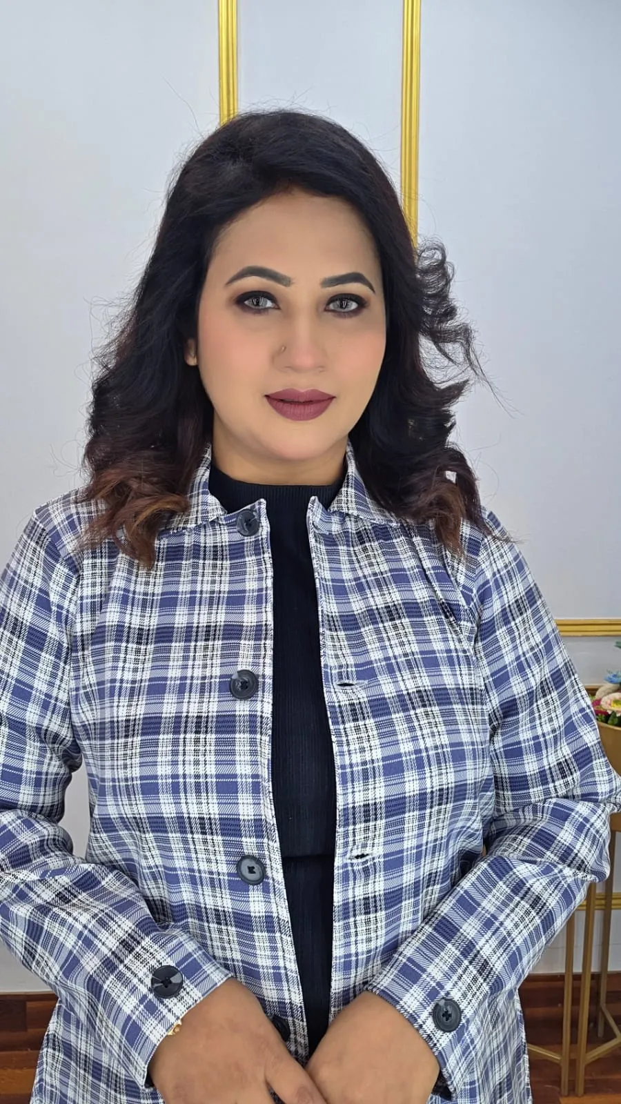 Featuring a shirt-style neckline collar, visible decorative buttons, and a timeless check pattern, this long blazer blends classic tailoring with modern fashion. The full-length sleeves and functional side pockets add practicality, while the extended length enhances a sleek, flattering silhouette.
