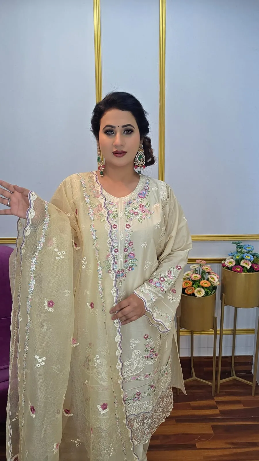 Exclusive Cotton Ready Three Piece, designed for women who love elegance with premium detailing. Crafted from high-quality exclusive cotton fabric, this outfit features fully sequin embroidery work that adds a luxurious and eye-catching finish. The set includes a beautifully embroidered quota cotton dupatta and a matching embroidered pant, creating a perfectly coordinated look. With its free-size fit, this ready three piece offers comfort, style, and effortless wear—ideal for festive occasions, parties, and special events.