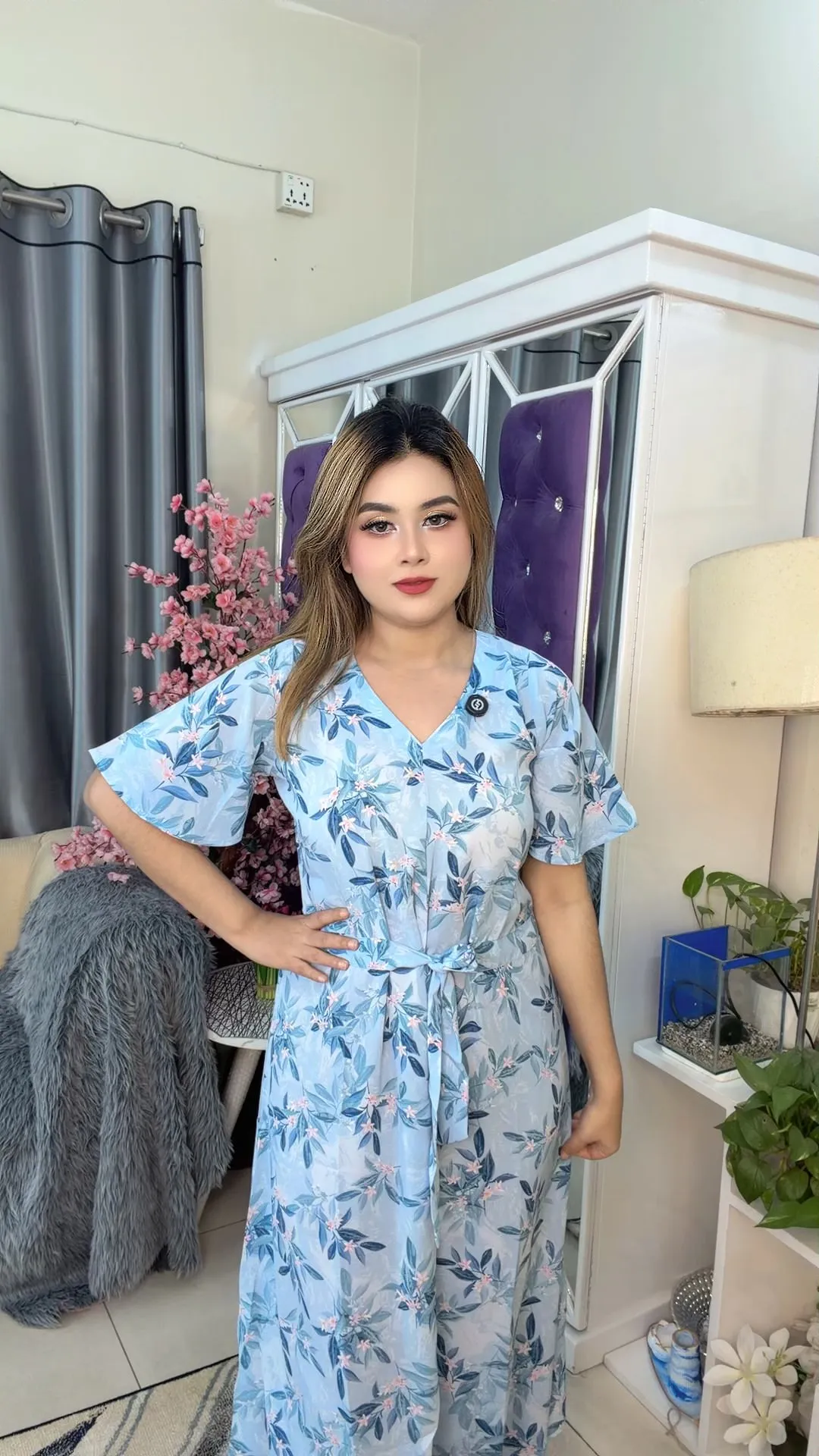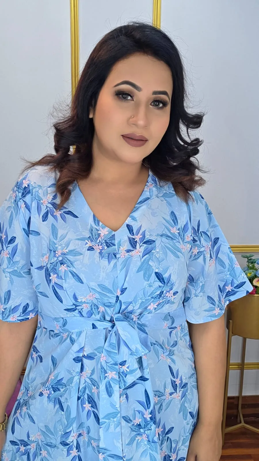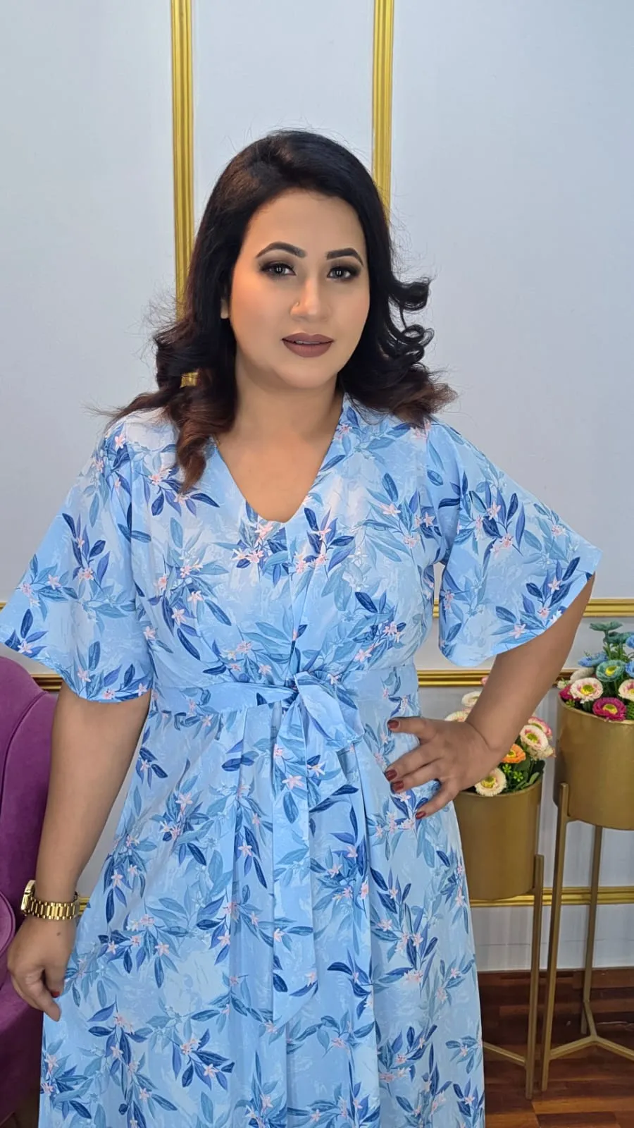 Style with this elegant Western Midi Gown crafted from exclusive georgette fabric. Featuring an adjustable tie-up belt at the waist, loose short sleeves for comfort, and a flattering V-neckline, this gown is adorned with a stunning all-over botanical leaf print in soothing teal patterns. Available in sizes 38-50, it offers the perfect fit with measurements ranging from M (36-38) to XXL (48-50). Ideal for casual outings or special occasions, this gown combines comfort and style effortlessly.