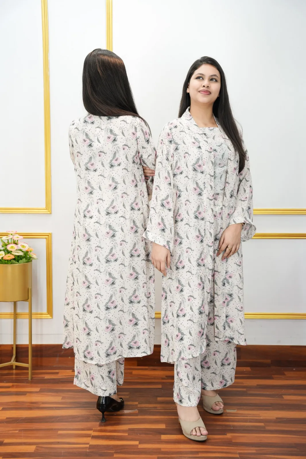 The set includes a stylish inner (body size 34–46) paired with a flowy shrug (body size 38–50) that creates a chic and trendy appearance. Perfect for casual outings, gatherings, or smart everyday fashion, this co-ord set offers both comfort and elegance.