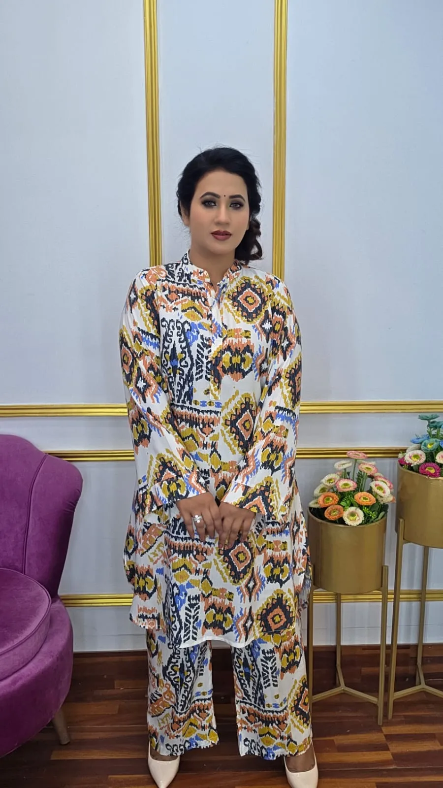 Imported Linen Co-ords Set, crafted for comfort and effortless elegance. Made from premium imported linen fabric, this outfit features a Panjabi-style round shape design that adds a unique, ethnic touch. The full sleeves and relaxed co-ord fit ensure all-day comfort, while the stylish silhouette makes it perfect for casual outings, office wear, and day events. Designed to flatter body sizes 40–52, this set blends modern fashion with timeless appeal.