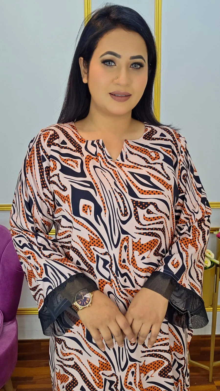 The set includes a stylish top and matching pant, offering a comfortable fit for body sizes 34–48. With a dress length of 34–36 inches and pant length of 38–40 inches, it creates a balanced and flattering silhouette.