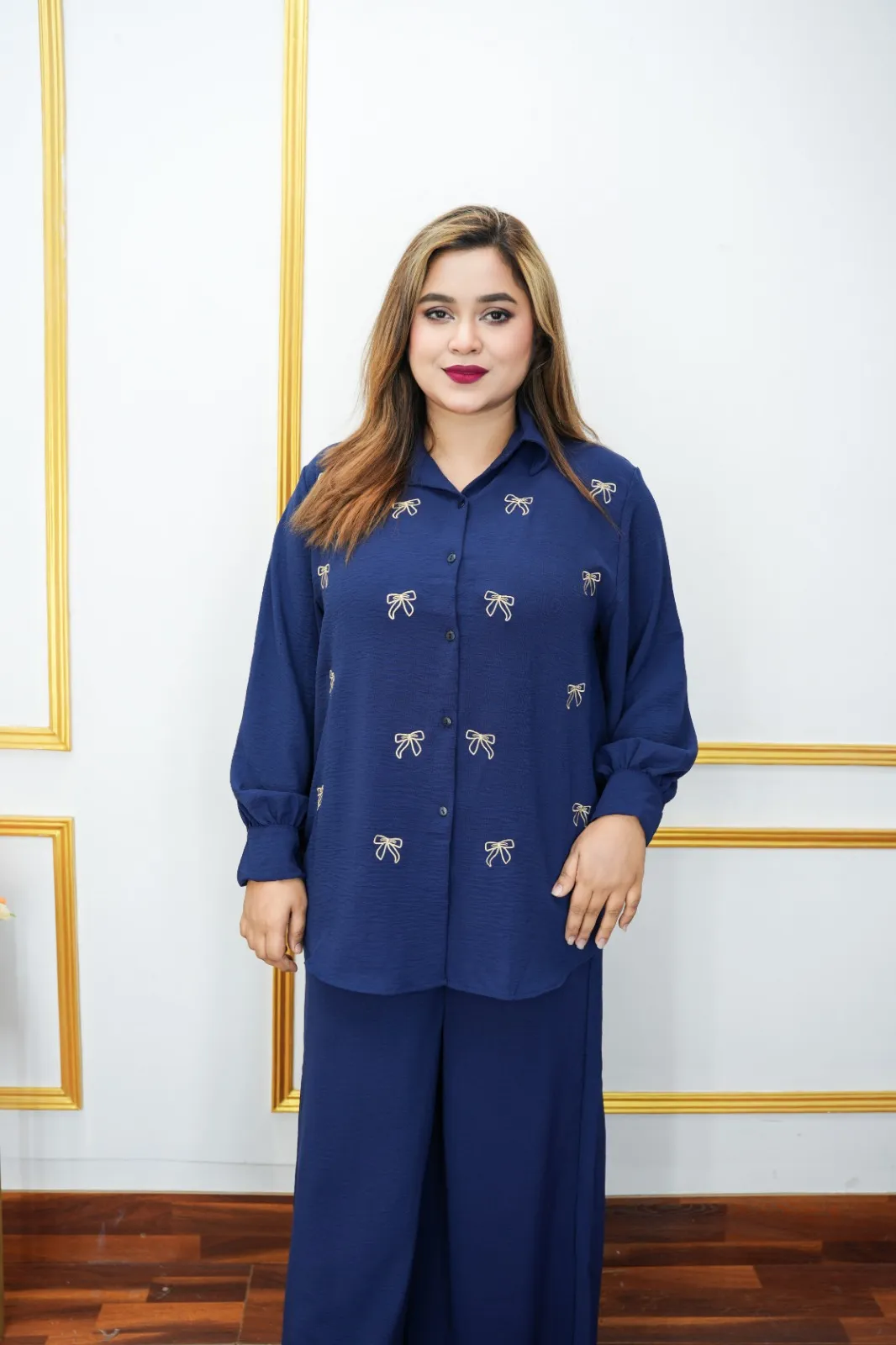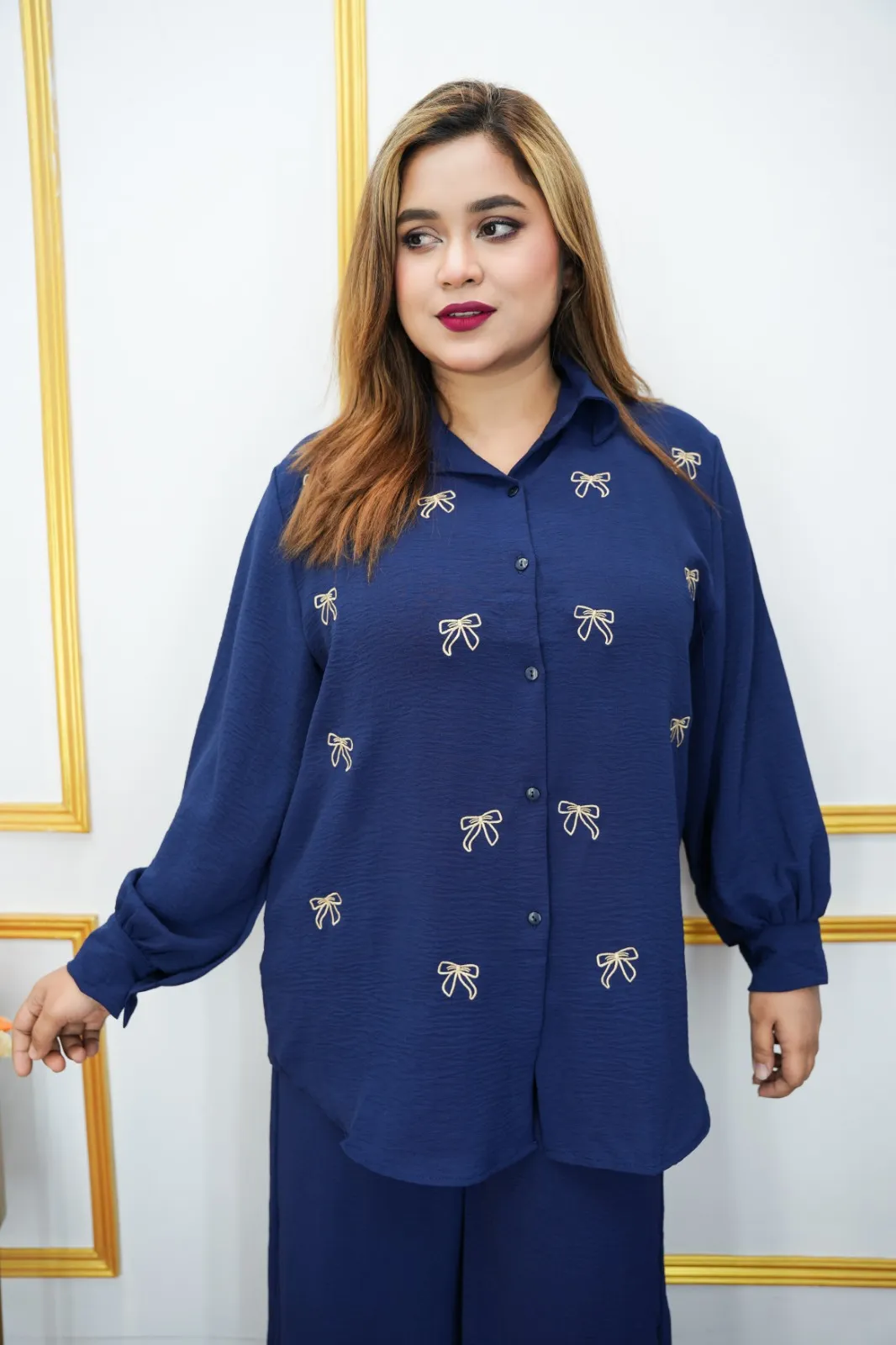 The set features a stylish shirt collar with fully open button design, enhanced with elegant embroidery work that adds a touch of sophistication. The full sleeve shirt paired with a matching pant creates a trendy coordinated look, perfect for casual outings, daily wear, or small gatherings.