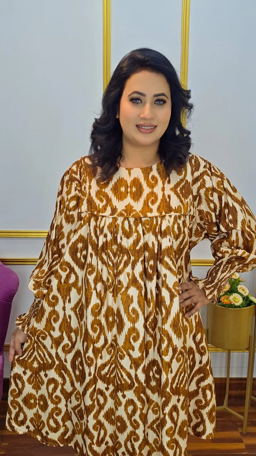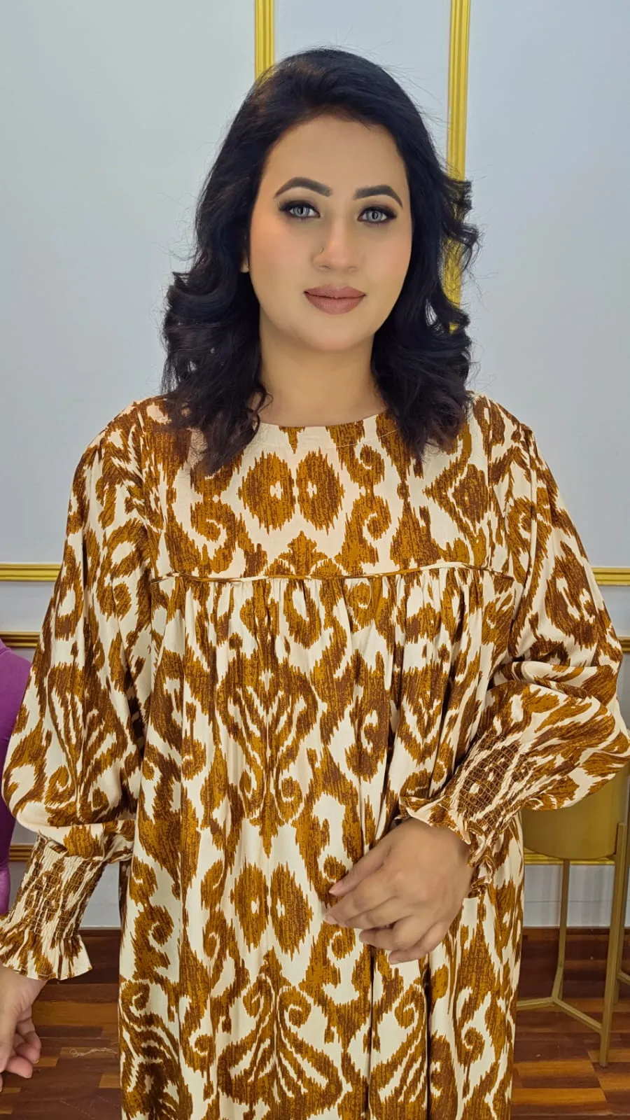 This Kaftan Style Co-Ord Set, crafted from premium imported linen fabric for a breathable, lightweight, and comfortable fit. The set features full sleeves with smokey detailing and a trendy digital print, giving it a modern, chic look.