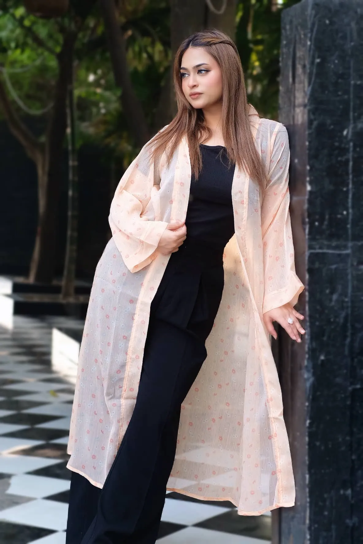 Add a touch of elegance to any outfit with this beautiful long shrug, crafted from luxurious georgette fabric. Featuring delicate small flower prints, this versatile layering piece is the perfect addition to elevate your everyday and special occasion wardrobe.