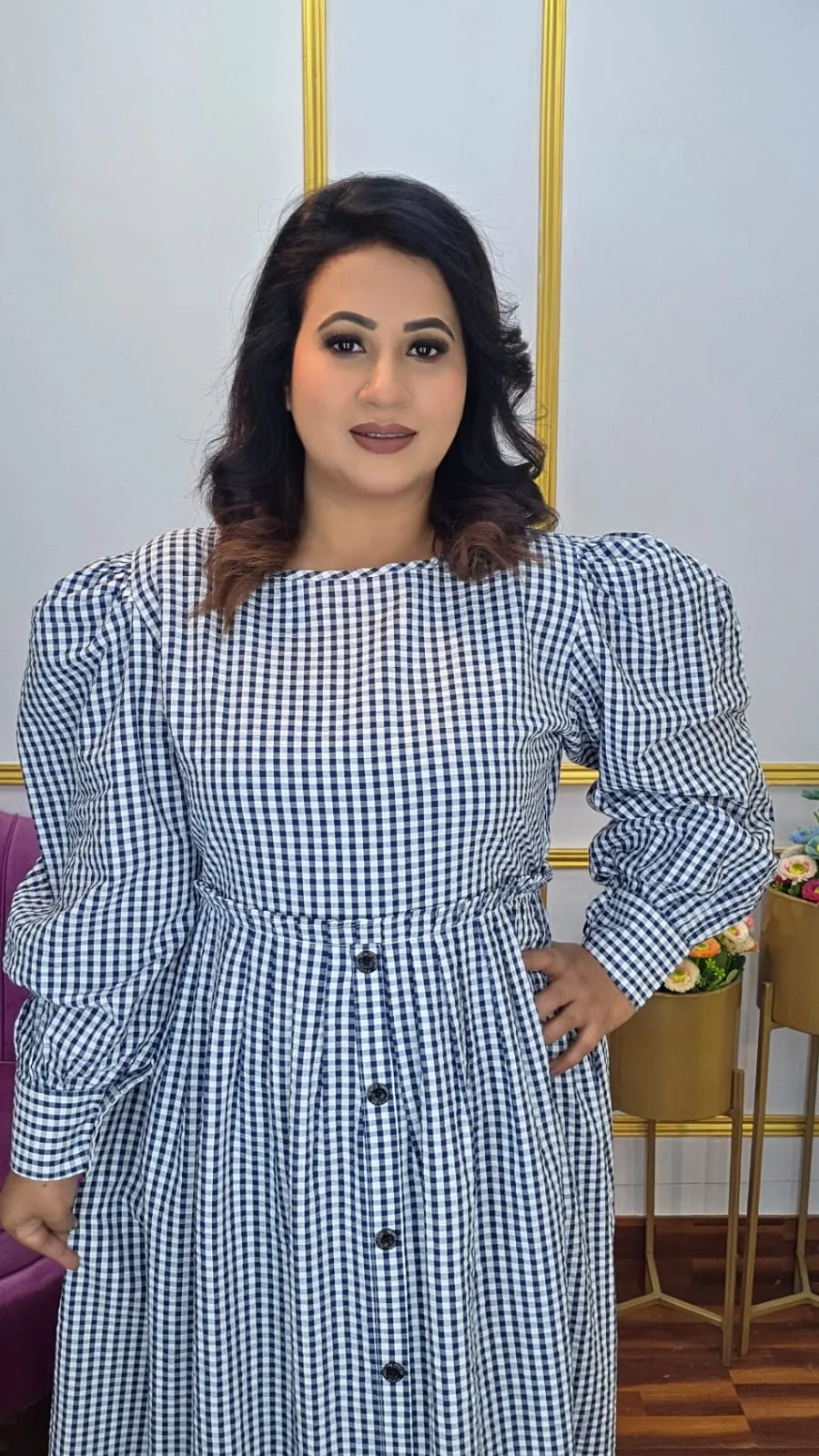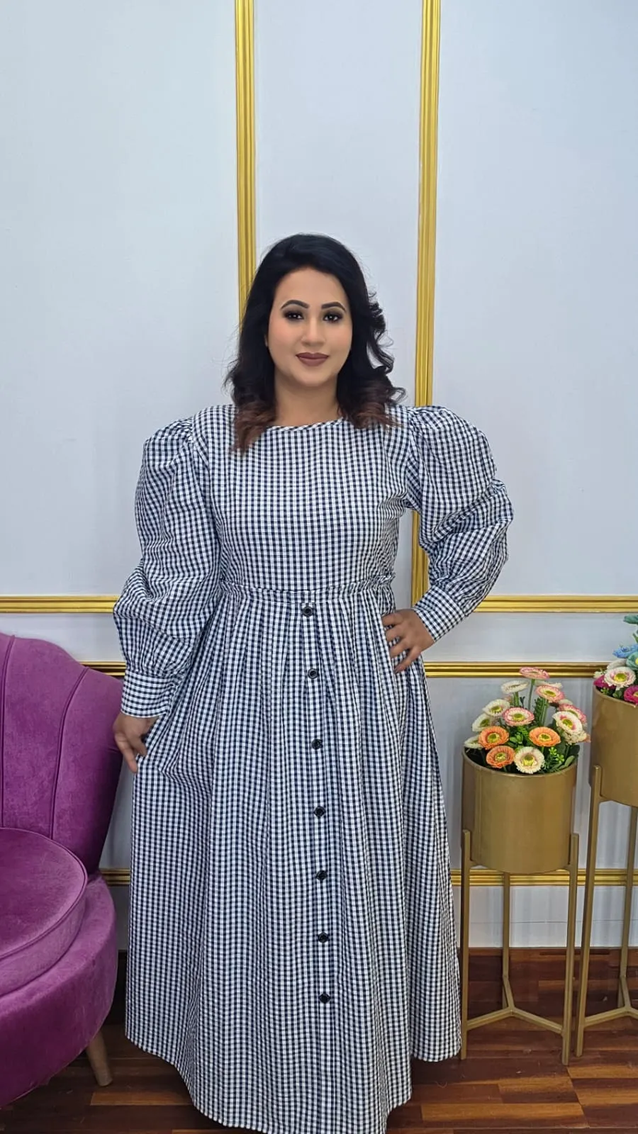 This premium cotton long gown, designed for everyday elegance. Made from soft and breathable cotton fabric, this gown features a modern blue, ash, and white check pattern that offers a fresh and trendy look. The full sleeves, front show buttons, and adjustable back belt ensure a flattering fit for all body types. Its graceful long length makes it perfect for casual wear, office outings, or day events.