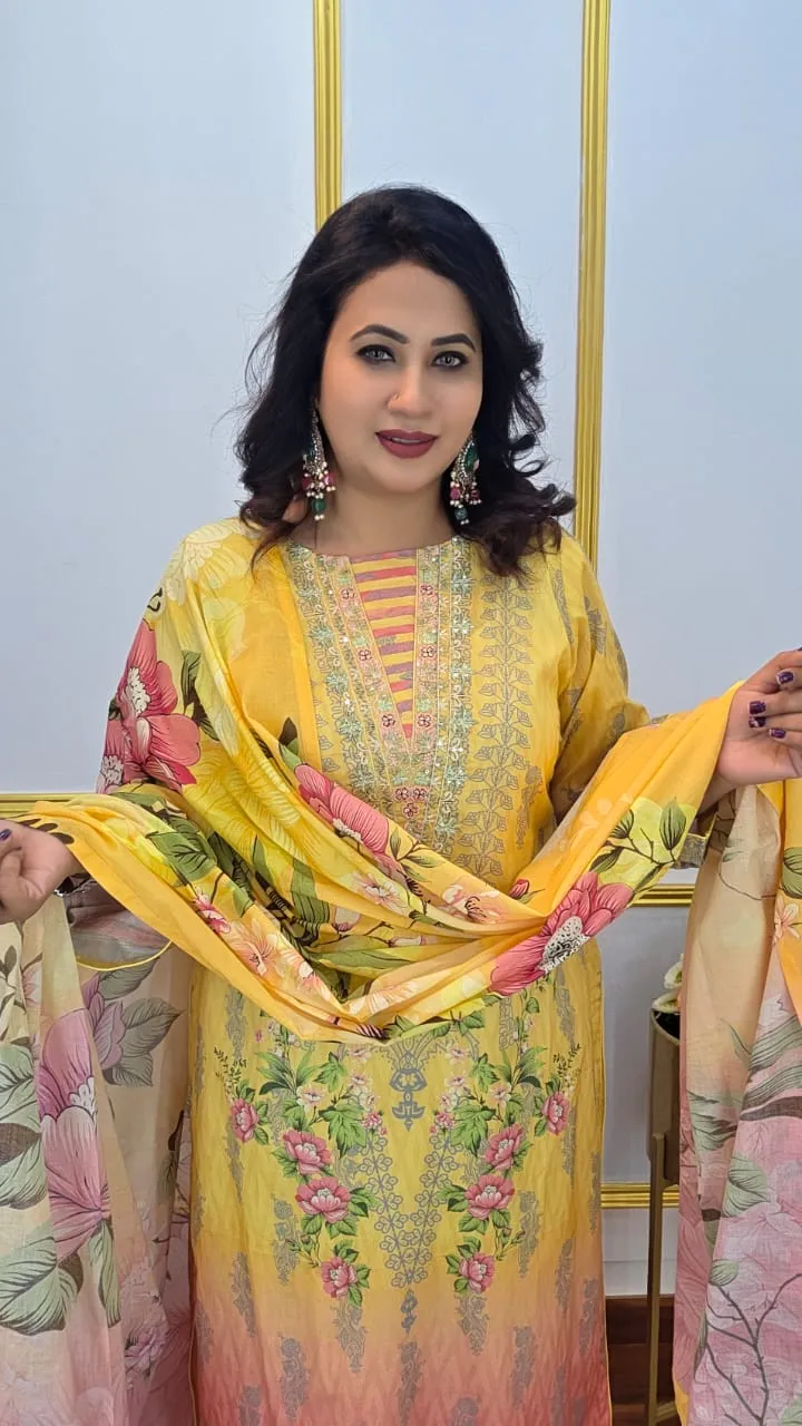 Experience the luxury cotton premium collection with this exquisite unstitched three-piece suit that combines vibrant digital print with elegant sequence embroidery. Designed specifically for plus-size women (80+), this stunning set offers premium quality, generous fabric, and endless customization possibilities.