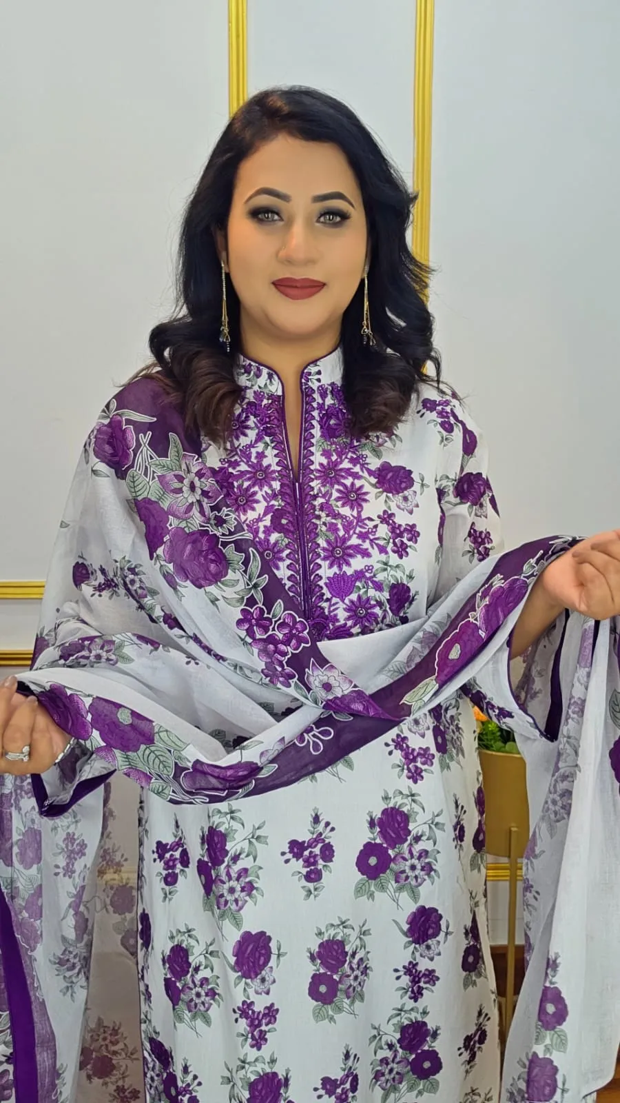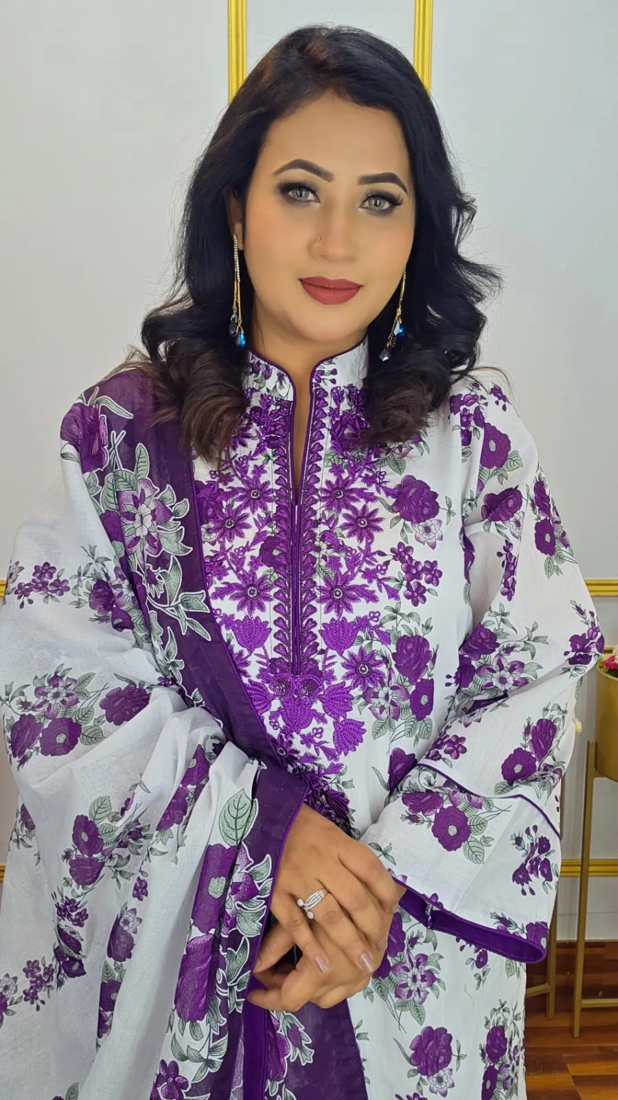 Luxury Cotton Ready Three Piece, crafted from premium luxury cotton fabric for all-day comfort. The outfit features a fully digital printed body and orna, enhanced with both-side cord piping finishing for a polished look. Subtle yet elegant embroidery work adds a touch of grace, making it perfect for daily wear, office use, and casual outings. Designed in a flattering ready-to-wear fit, this set blends modern fashion with timeless comfort.