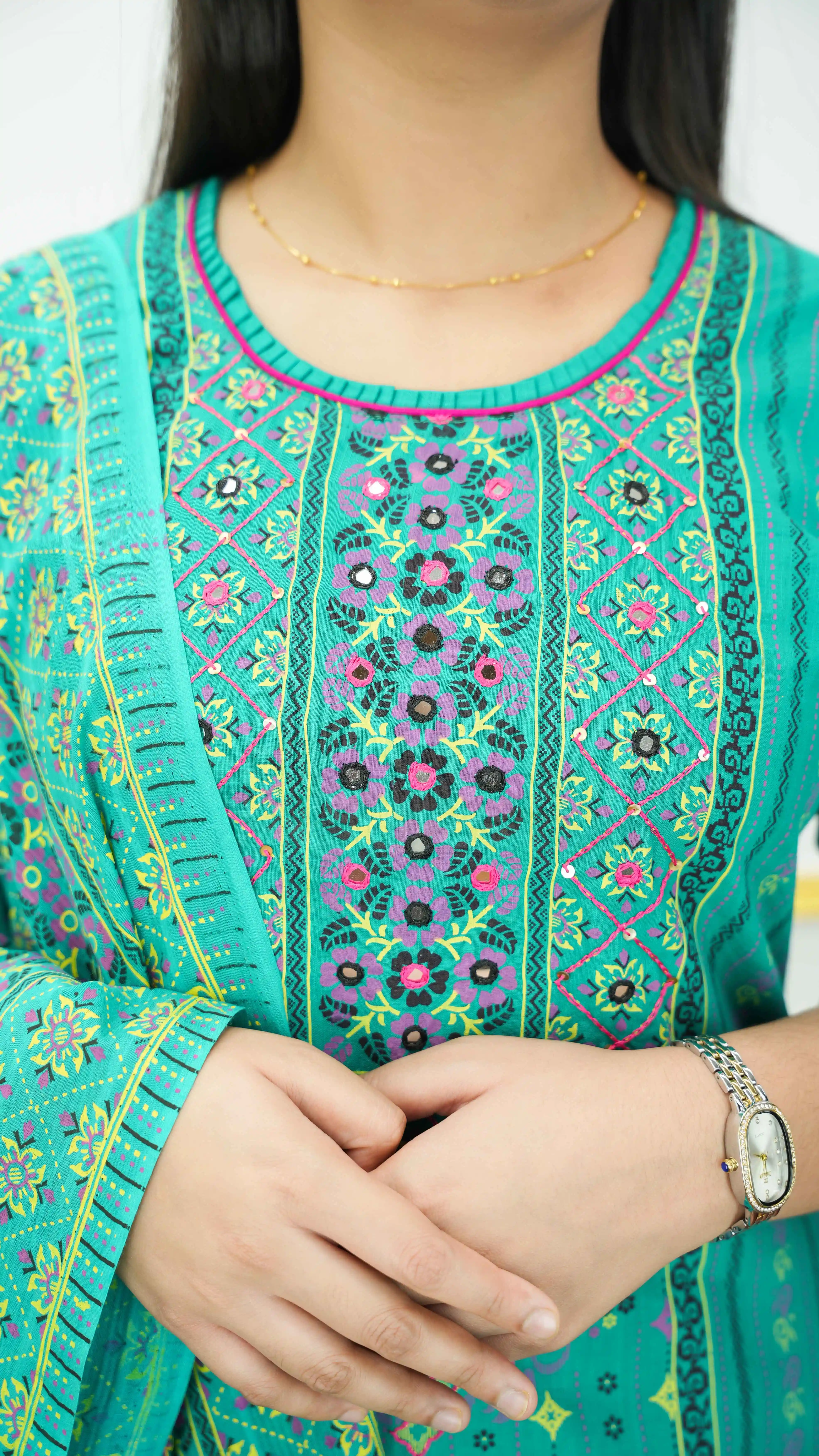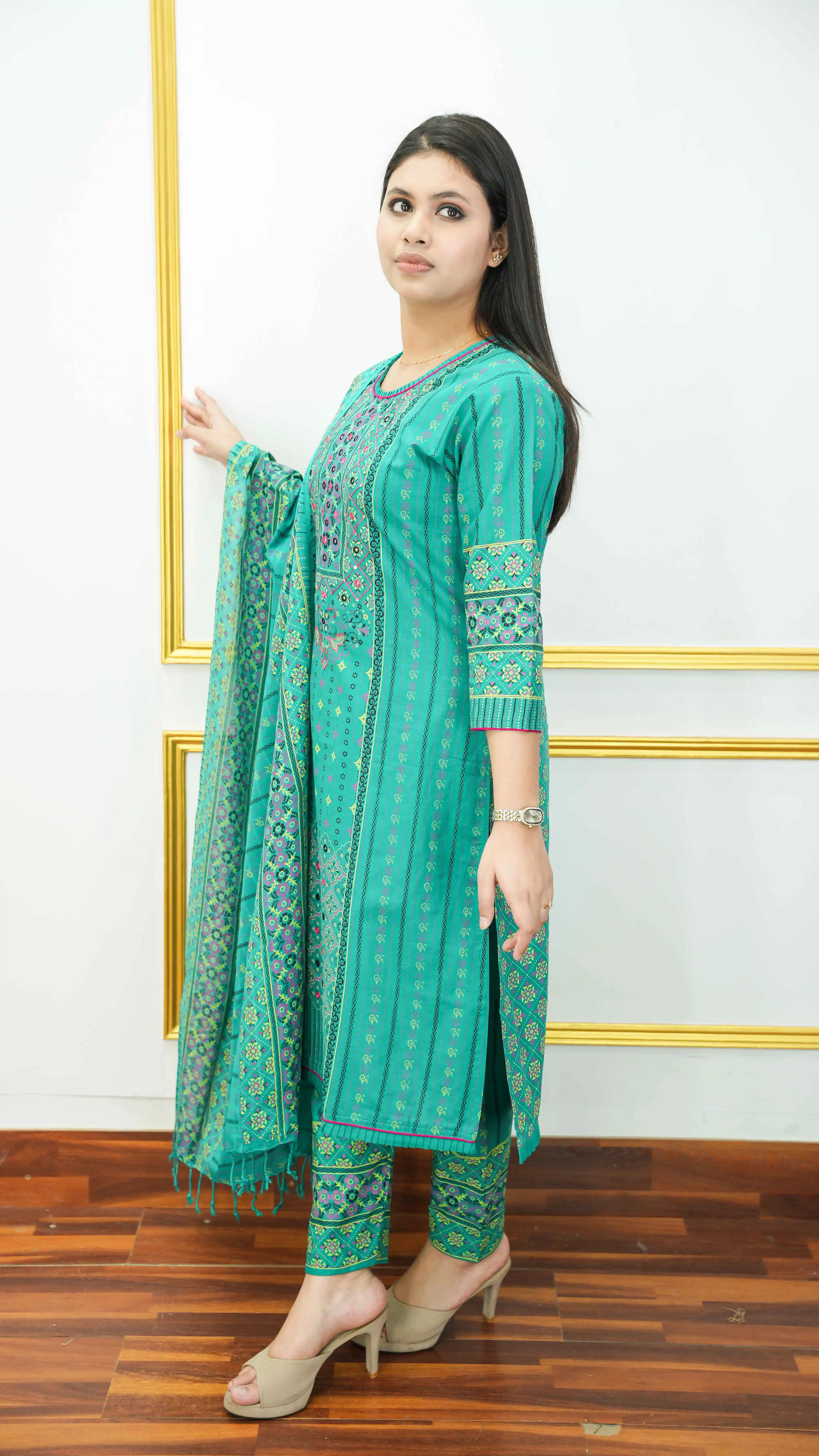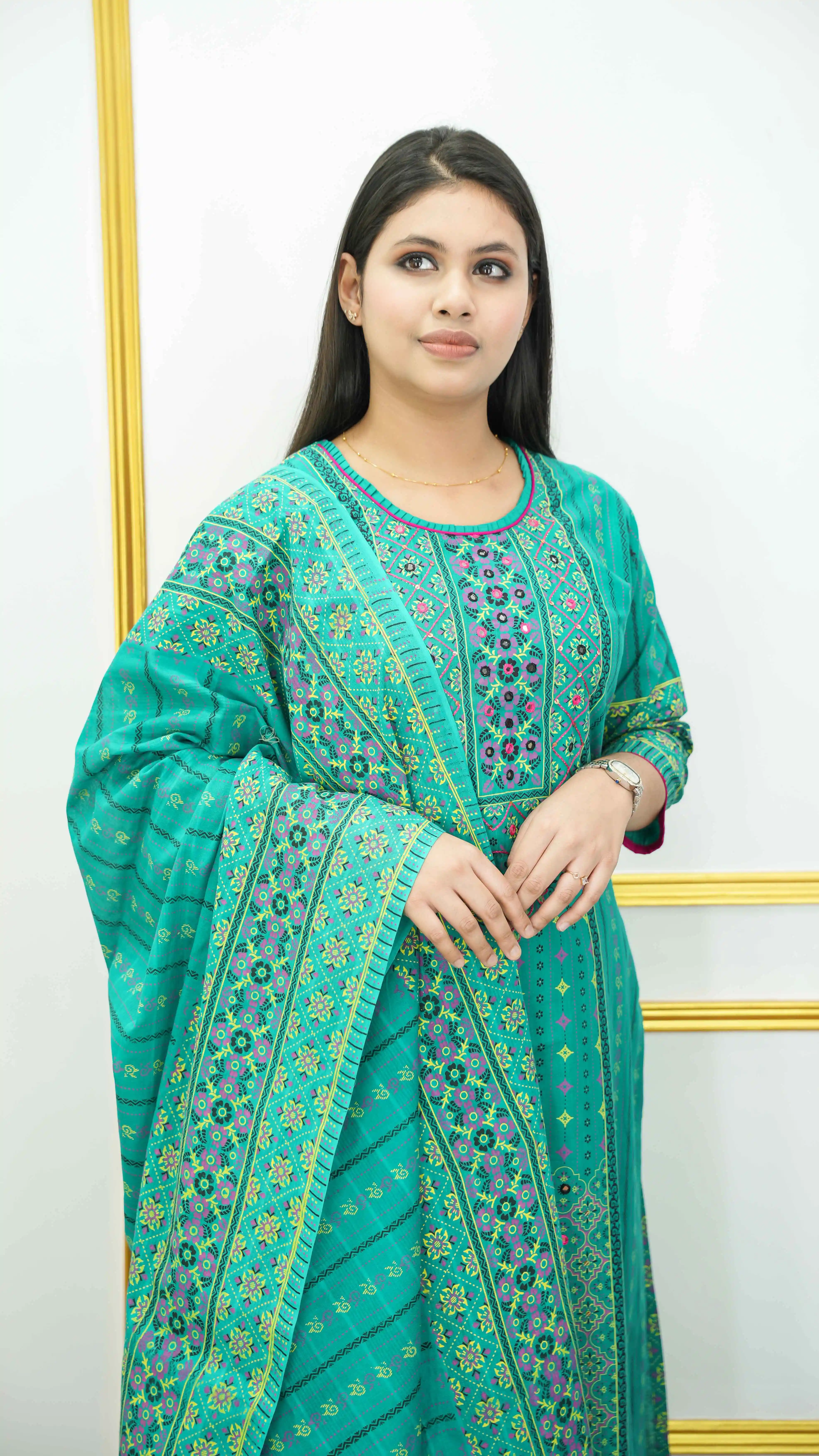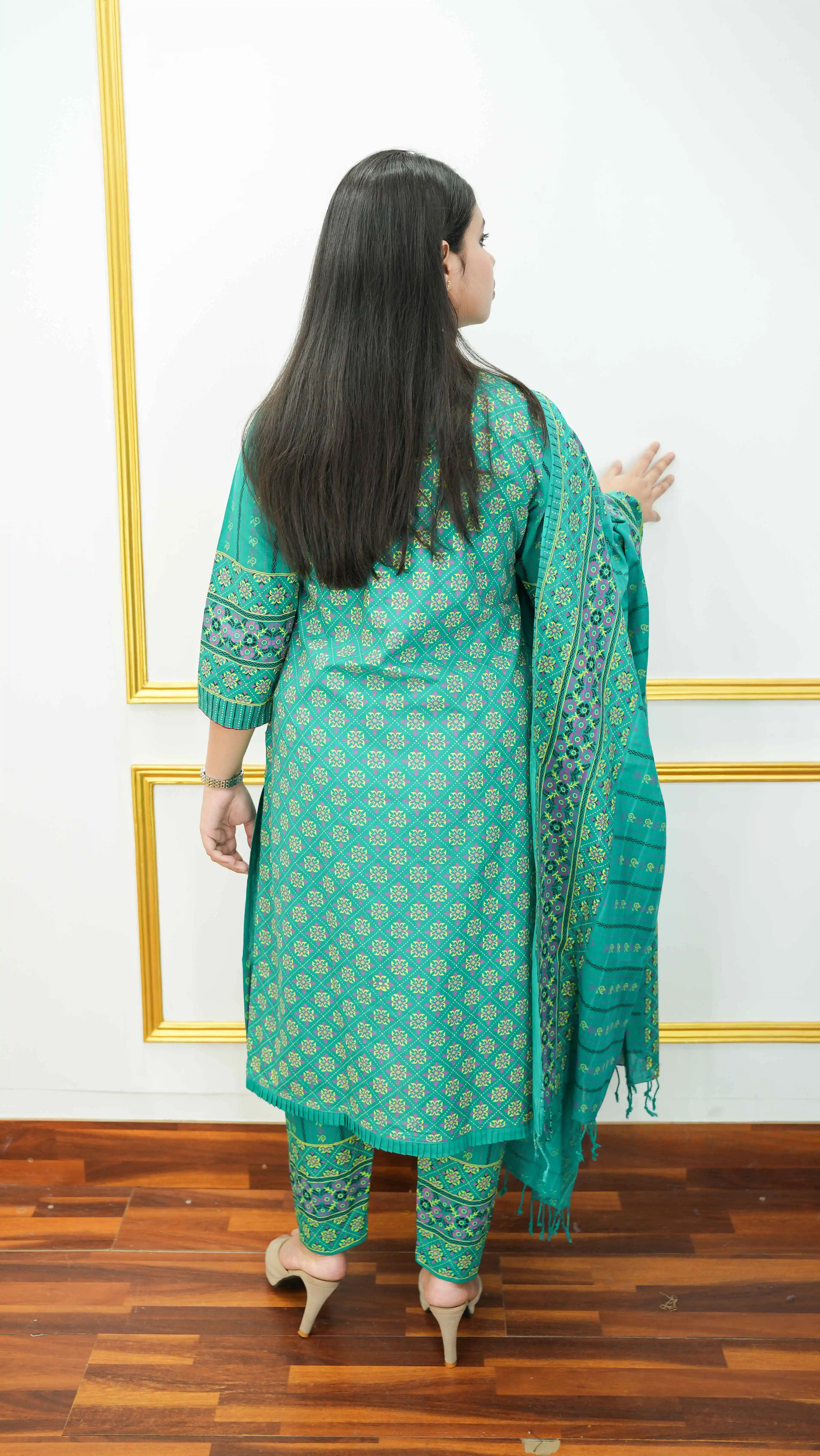 Embrace traditional elegance with this exquisite Ready Three Piece Cotton Suit featuring timeless geometric and floral motifs. Crafted from premium luxury cotton fabric, this complete ensemble delivers superior comfort and sophisticated style, perfect for daily wear, festive occasions, or professional settings.