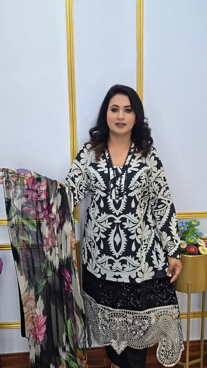 Upgrade your wardrobe with this Luxury Cotton Unstitched Three Piece Set, designed for elegance and comfort. Featuring vibrant digital prints on the body and orna, extra embroidery pieces, and a soft chiffon orna, this set allows you to create a perfectly tailored outfit with a graceful, boutique-style finish. Ideal for festive occasions, casual gatherings, or any event where sophistication matters.