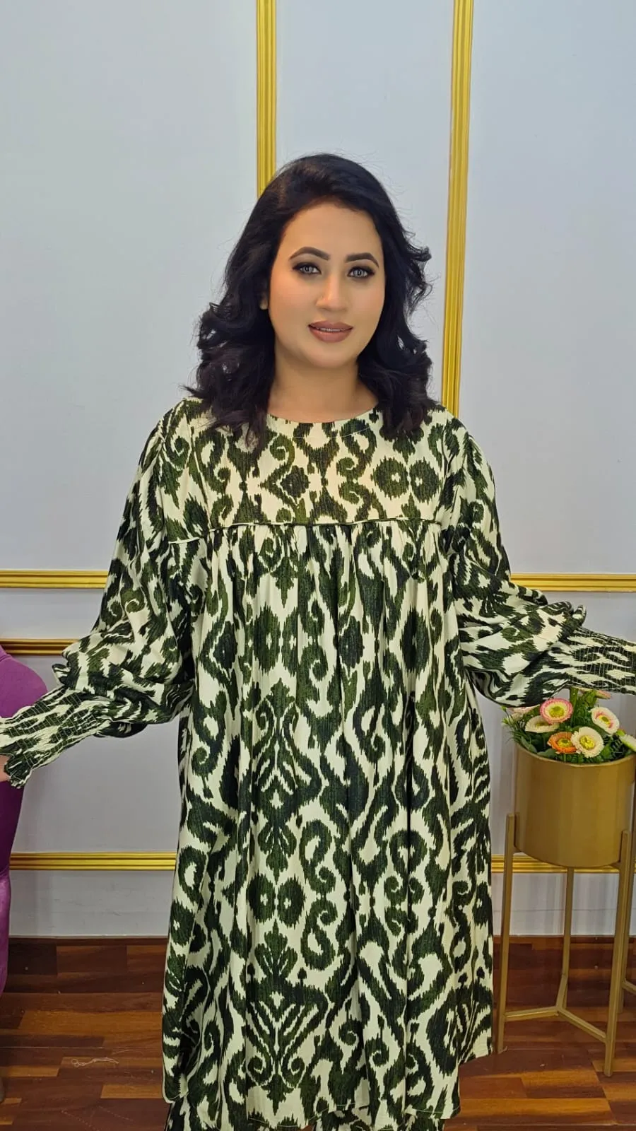 Effortless elegance with this Kaftan Style Co-Ord Set, crafted from premium imported linen fabric that is breathable, lightweight, and comfortable for all-day wear. The outfit features full sleeves with smokey detailing and a stylish digital print, giving it a modern and chic look.