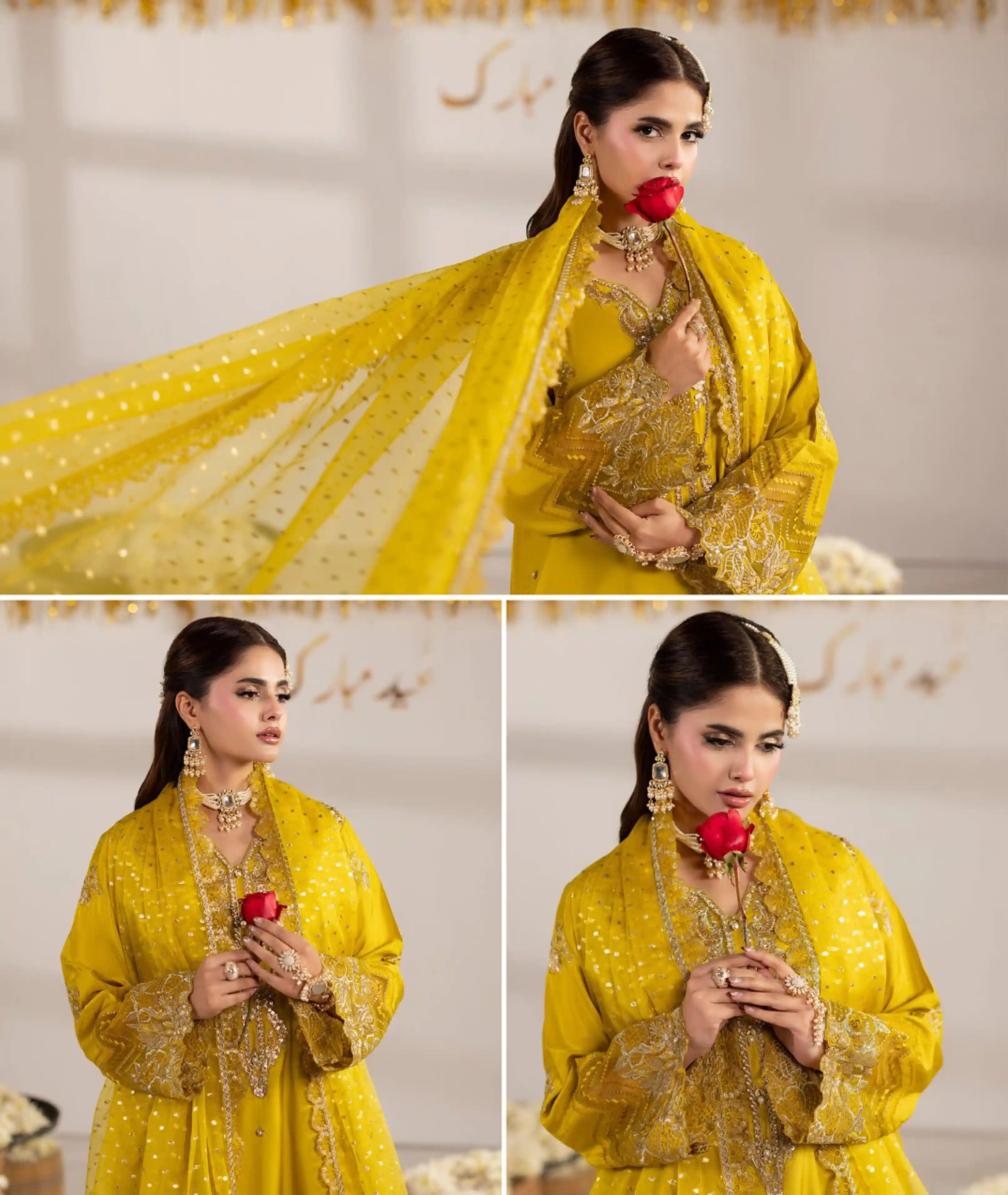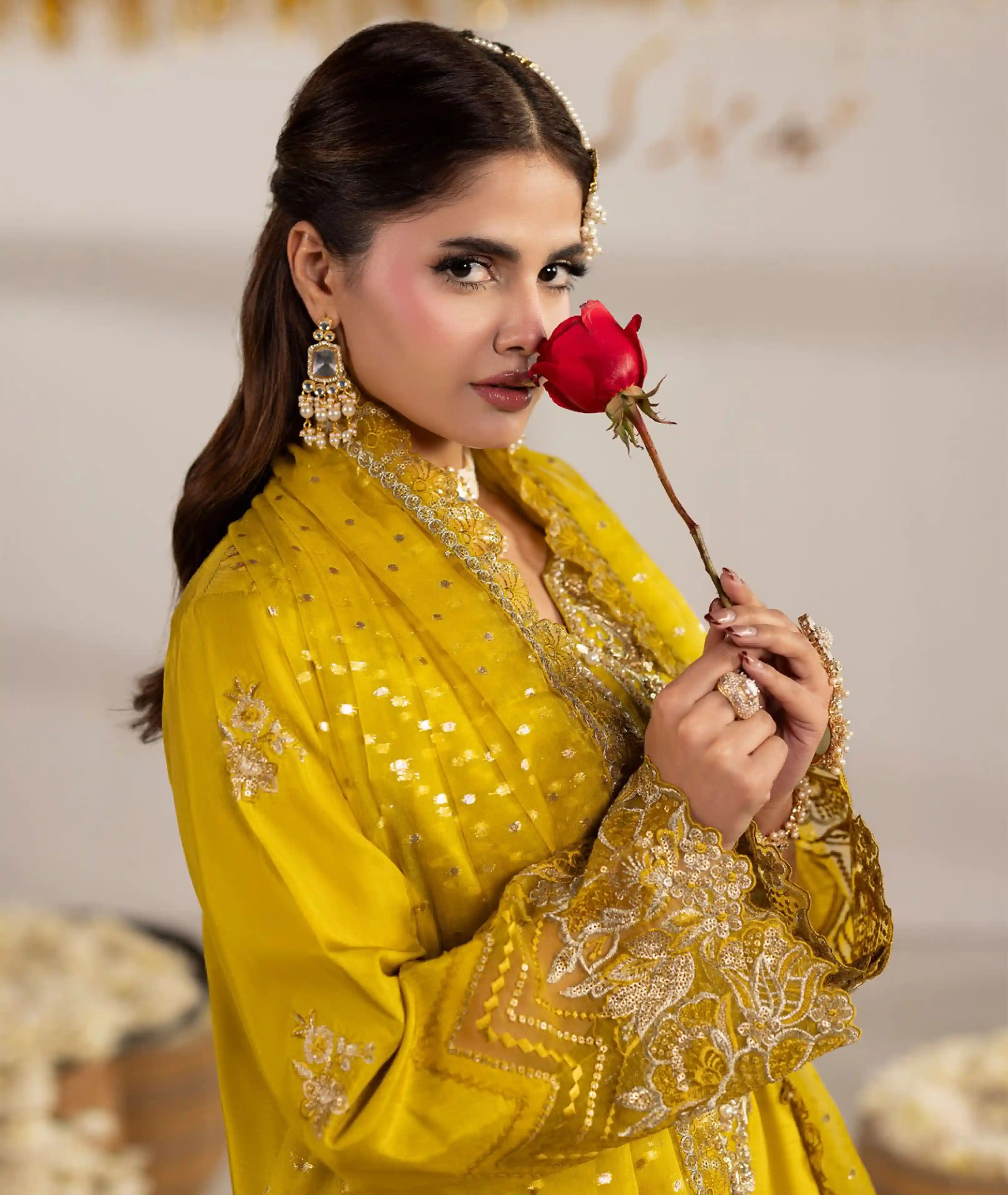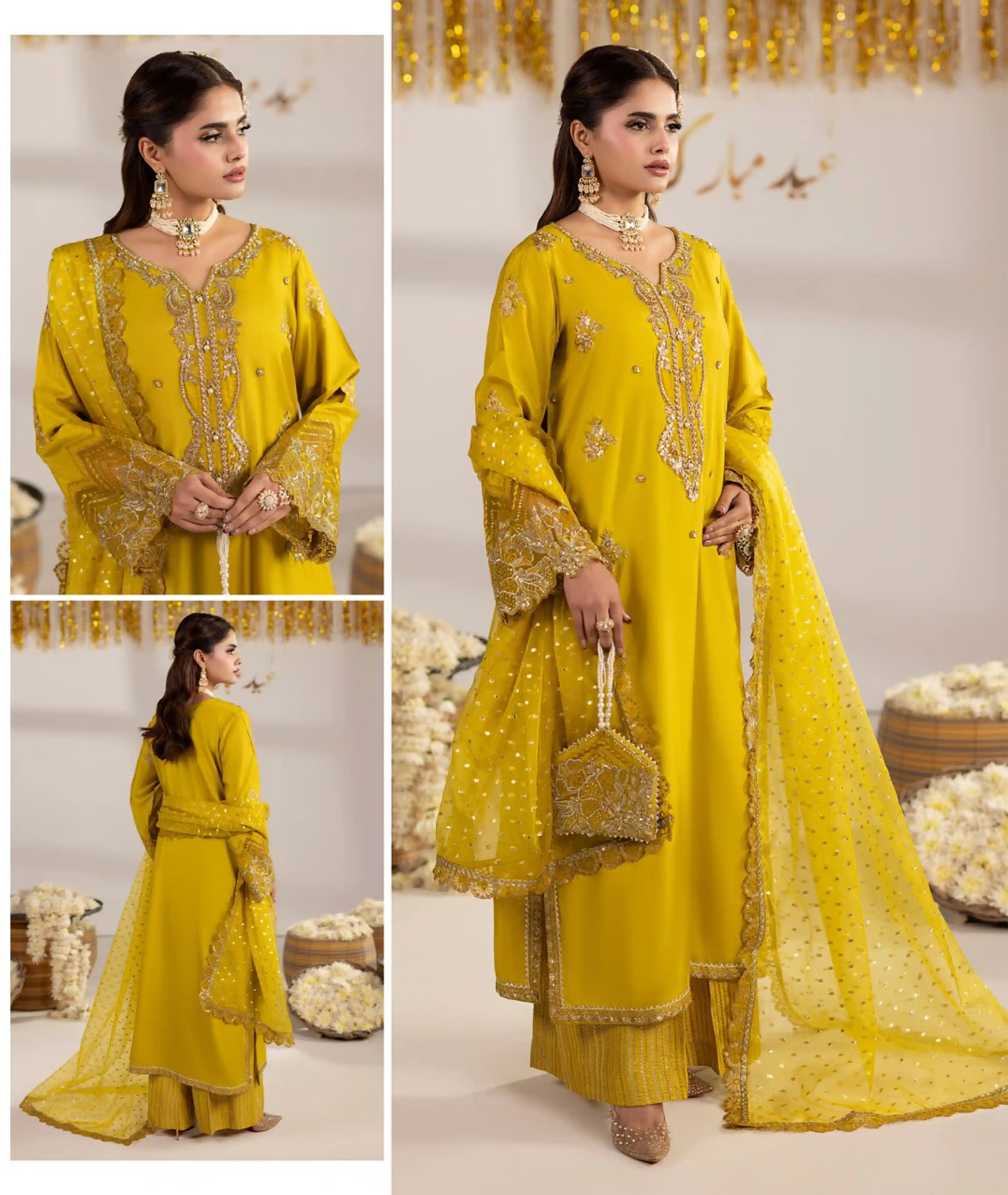 Designed for women who enjoy sophisticated and festive fashion, this opulent Pakistani three-piece set will help you step into elegance. This ensemble has a rich, silky feel and a beautiful finish since it is made from high-quality raw silk and organza fabrics.