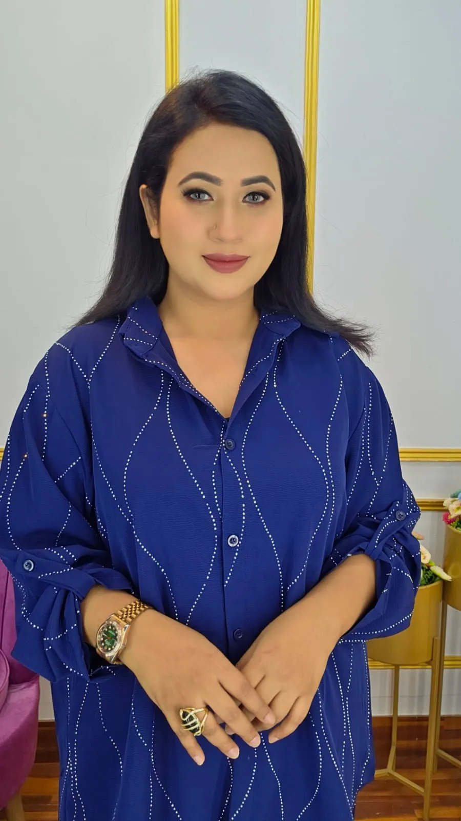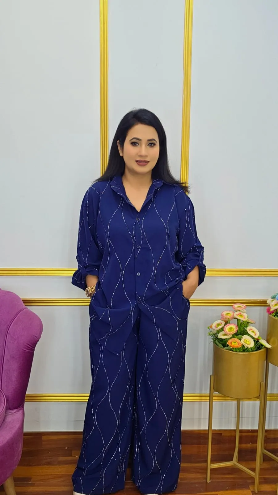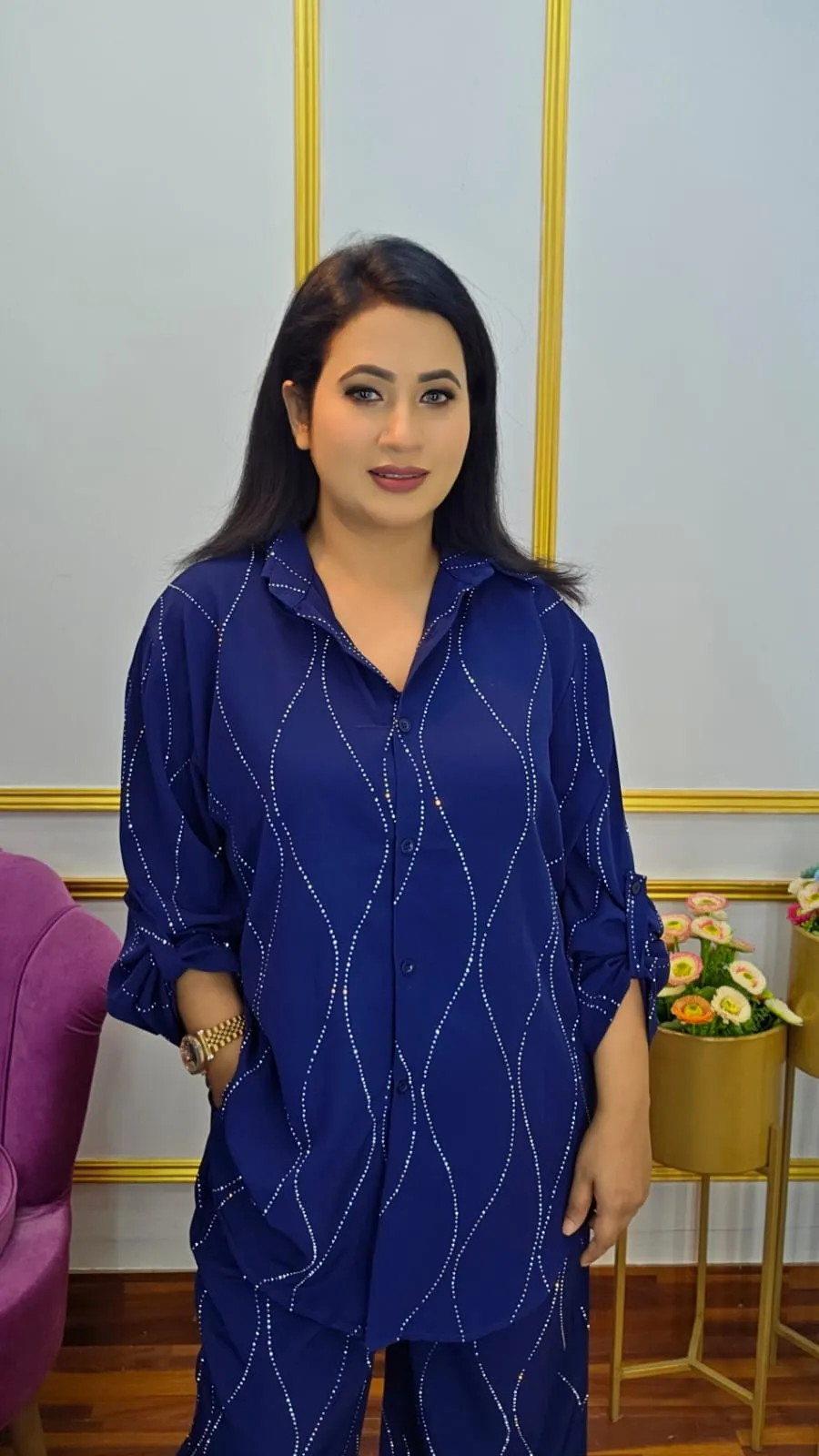 Designed with full sleeves and a stylish open button front, this co-ords set offers a modern yet graceful look. The free size body fit ensures comfortable wear, while the 40-inch pant length provides a flattering silhouette. Perfect for party wear, festive occasions, evening outings, or stylish casual wear.
