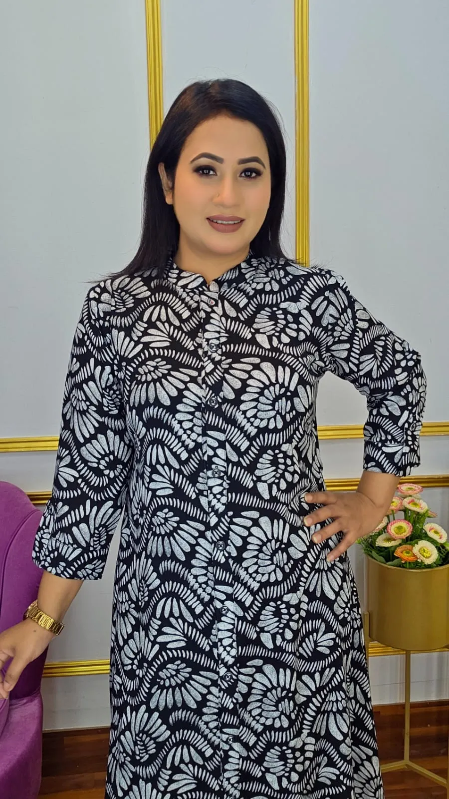 The shirt features three-quarter sleeves and a body size range of 34–48, offering a comfortable and flattering fit for most body types. With a length of 42–44 inches, this long shirt combines elegance and ease, making it perfect for casual outings, home wear, or office styling.