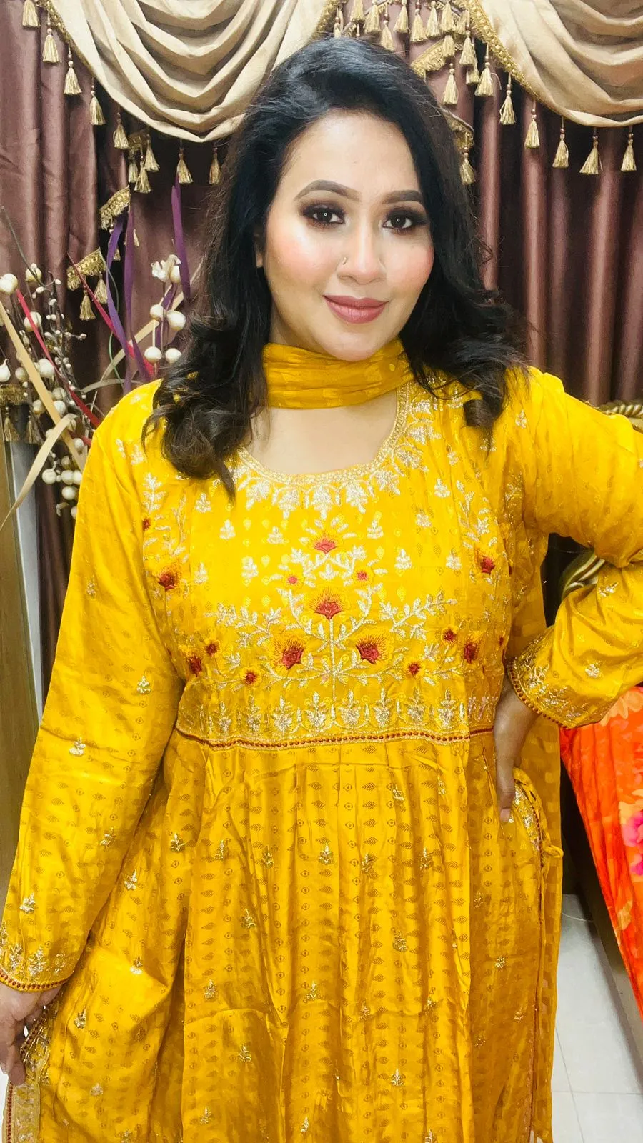 Step into elegance with the Nayra Gown, crafted from premium Jaquard Silk and adorned with allover embroidery with stone detailing. Designed for a flattering fit with a free body size 46 and a length of 50 inches, this gown is perfect for parties, festive occasions, or special events.