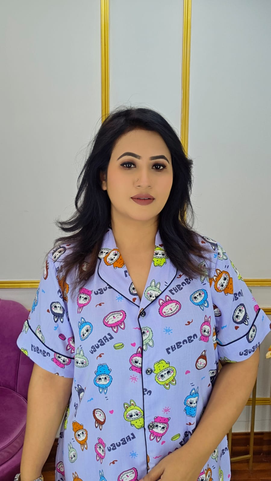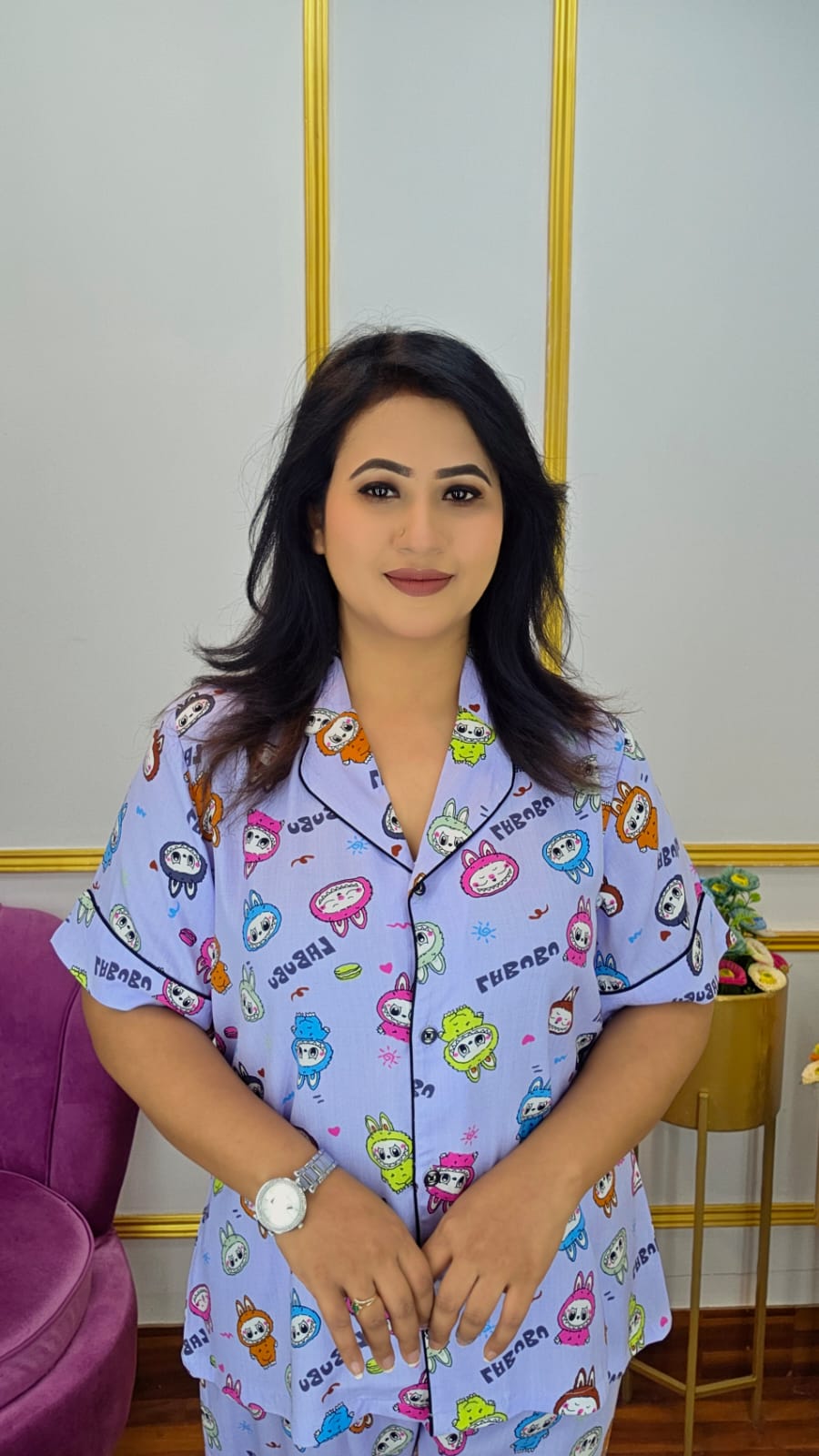 Upgrade your nightwear with this Imported Lilen Night Suit. Features open button, half sleeves, and side piping on pants for comfort and style. Available in sizes M to XXL. Perfect for daily wear and travel.