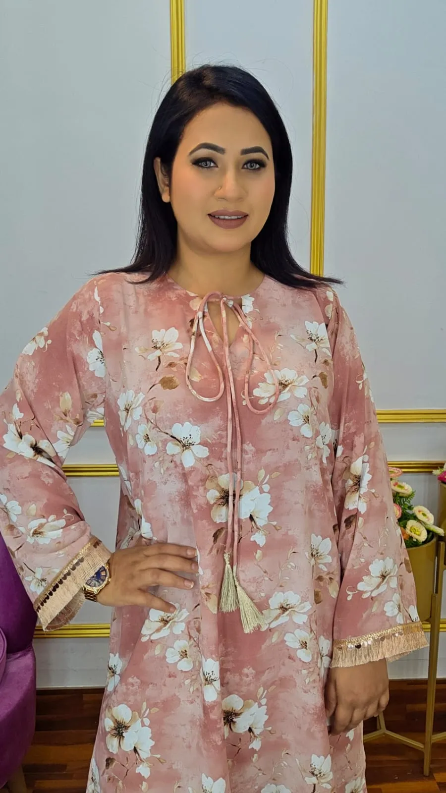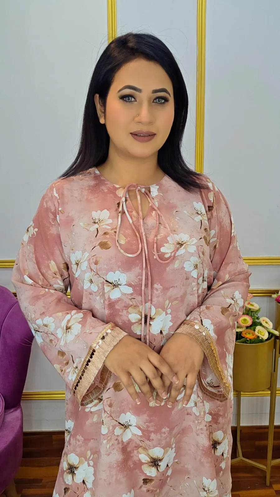 This Luxury Georgette Co-Ords Set featuring elegant lacing work, full sleeves, and a modern Pakistani design. Comfortable free-size fit (34–48) with dress length 36–38 and pant length 38–40, perfect for casual outings or festive occasions.