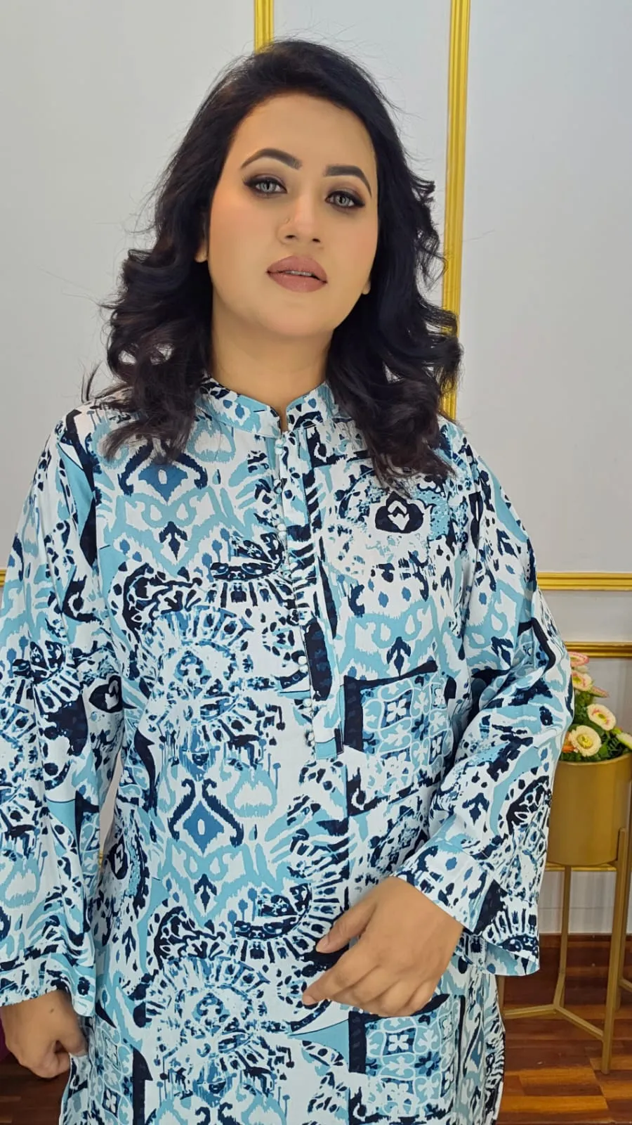 The top length of 38–40 inches and pant length of 38–40 inches provide a flattering fit for body sizes 34–48, making it suitable for casual outings, office wear, festive occasions, or semi-formal events. Its versatile design ensures easy pairing with accessories or footwear.