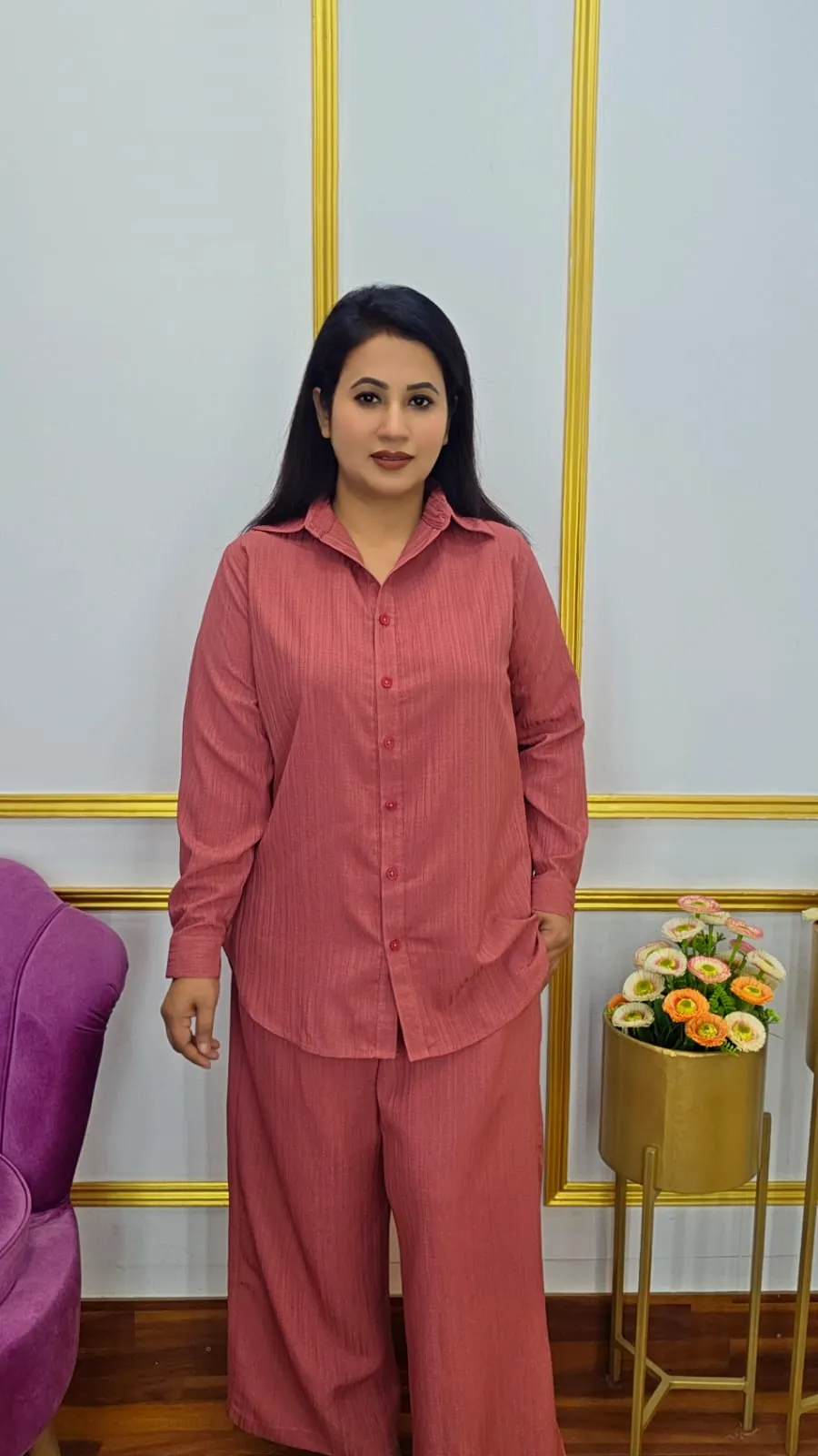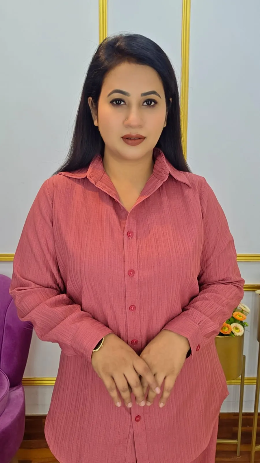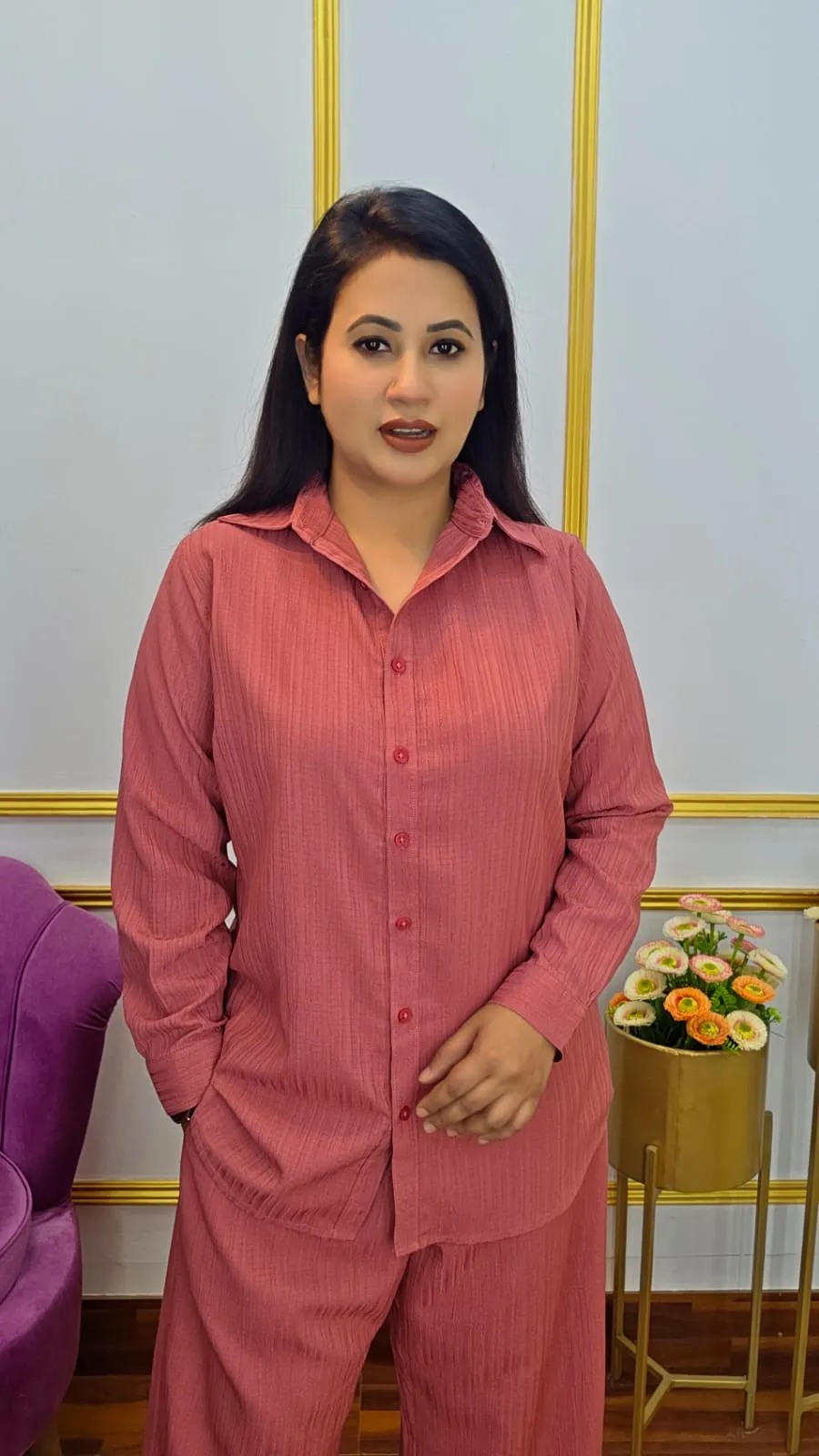 Your style with this elegant Co-ords Set made from lightweight pop georgette fabric. Featuring a classic shirt collar, open button design, and full sleeves, this set blends sophistication with comfort. Suitable for body sizes 36-50, it offers a flattering length ranging from 28 to 32 inches, perfect for both casual and semi-formal occasions.