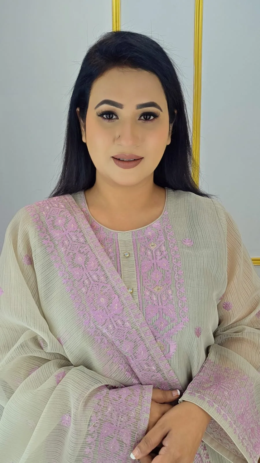 Step into a world of timeless sophistication with our exquisite Jamdani-inspired four-piece collection. Crafted from premium imported Kota organza, this unstitched set offers a perfect blend of lightweight comfort and opulent style. Designed for the modern woman who cherishes traditional roots, this outfit is your go-to choice for weddings, festivals, and high-end celebrations.