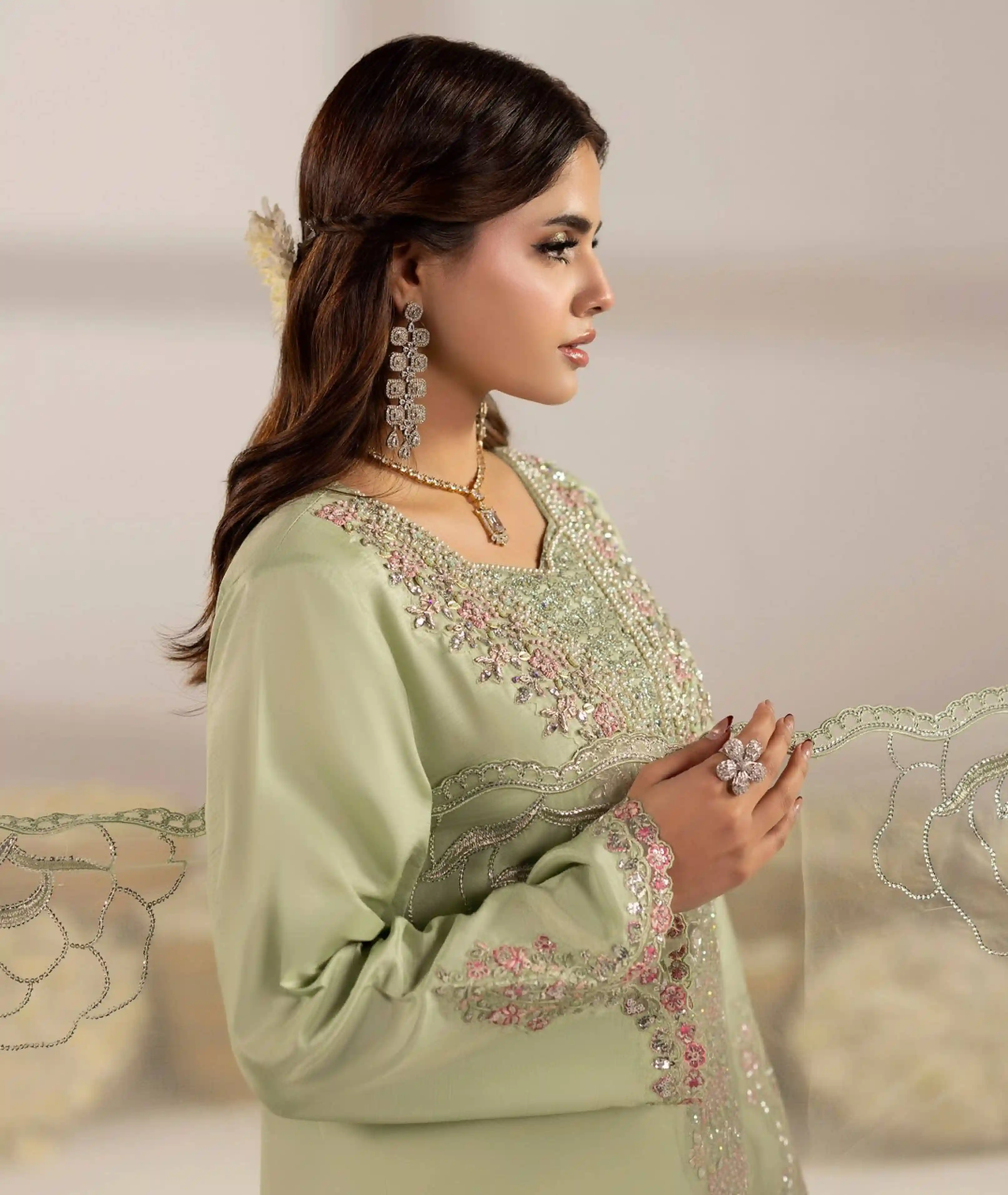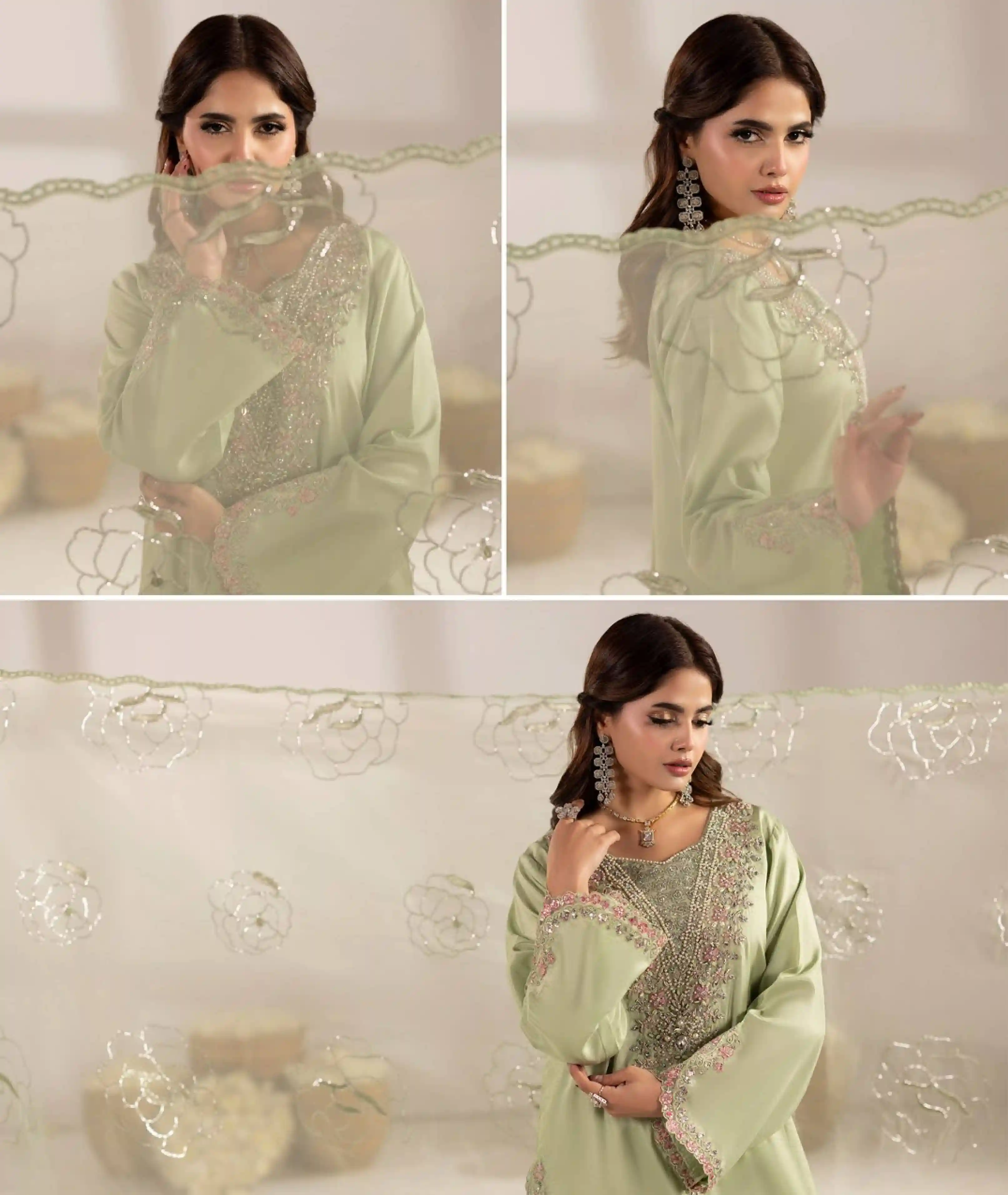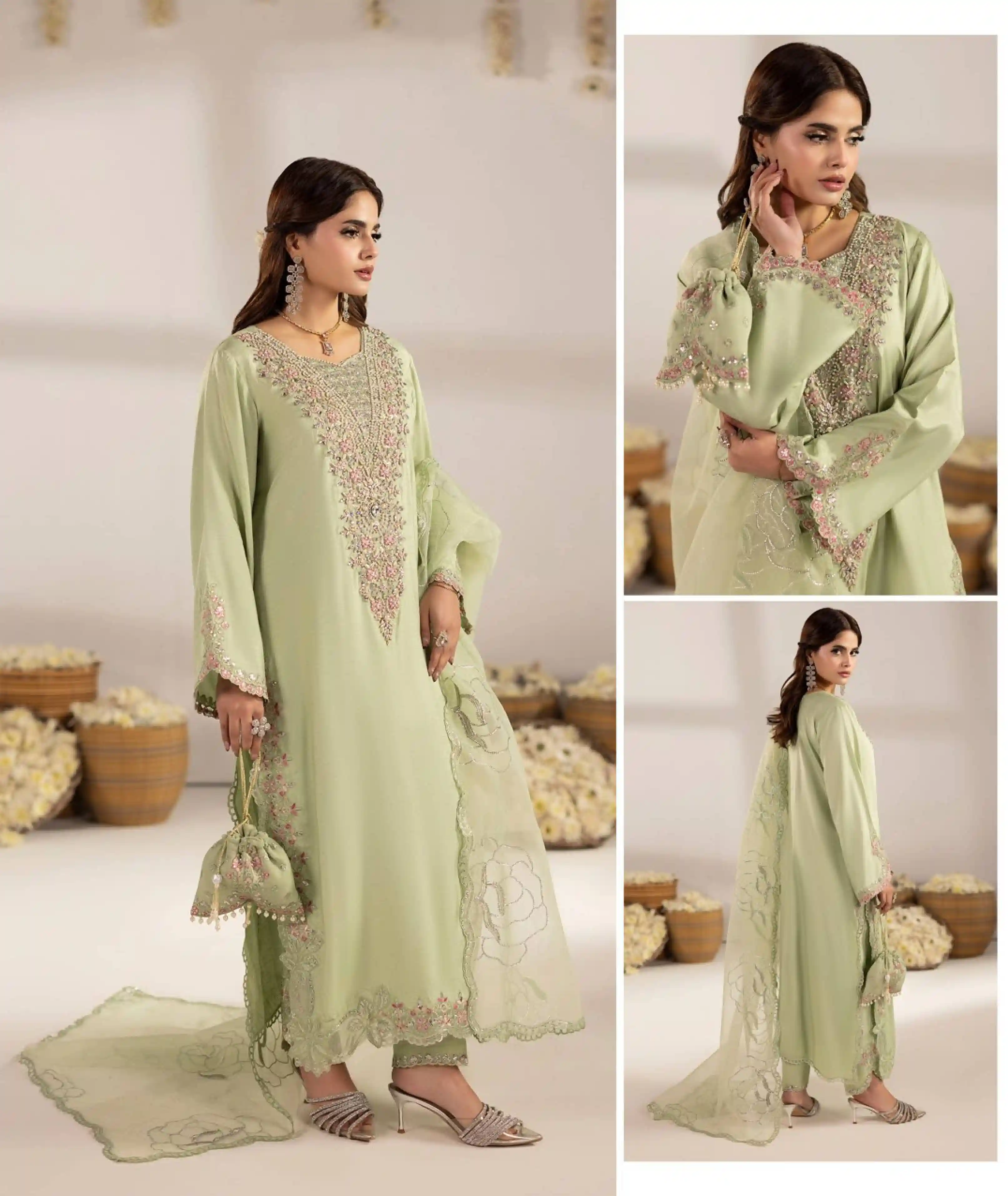 This elegant Pakistani Three-Piece Set, crafted from premium raw silk and organza fabrics. Perfect for weddings, parties, and special occasions, this outfit combines traditional craftsmanship with modern style.