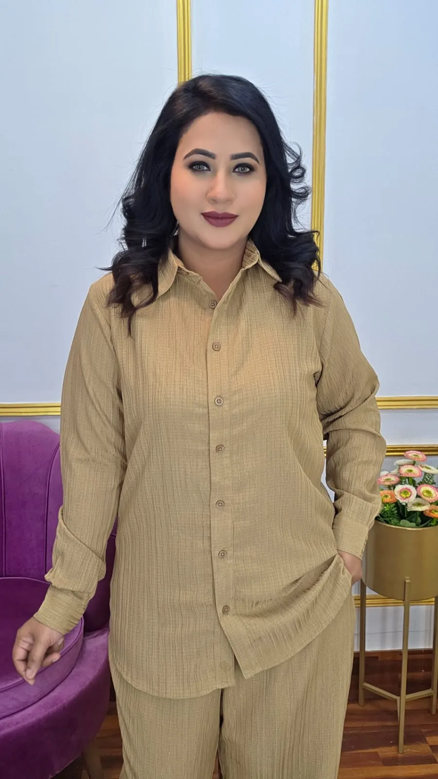 Upgrade your everyday style with this elegant Pop Georgette Co-Ords Set, designed for comfort, versatility, and a polished modern look. The set features a stylish shirt-collar top with open-button detailing and full sleeves, paired with a matching pant equipped with two functional pockets for convenience. Perfect for casual outings, office wear, or special occasions.