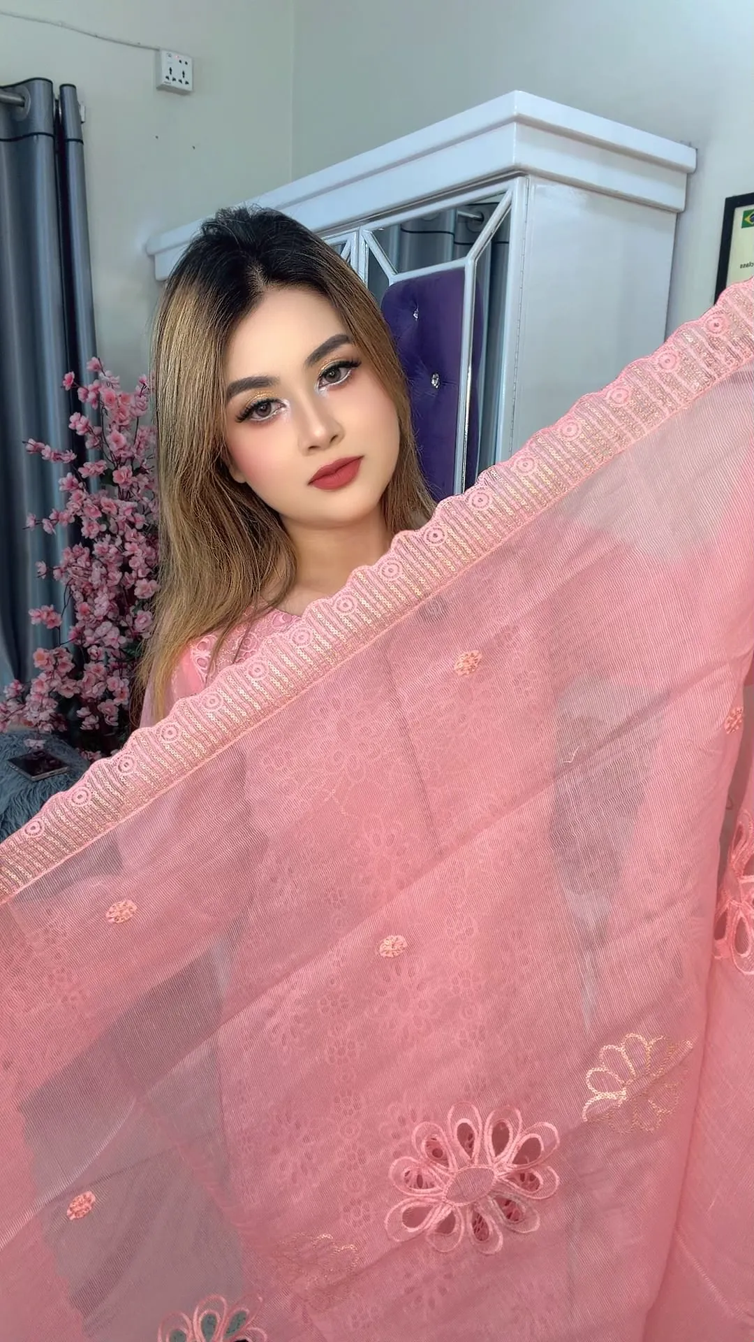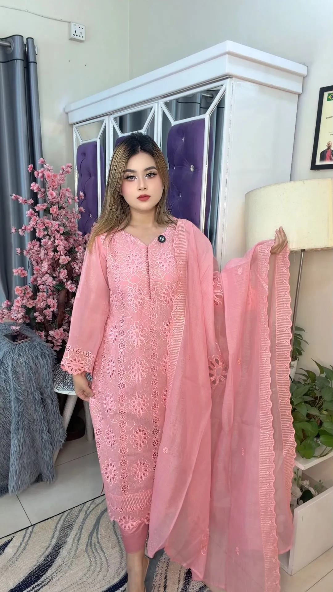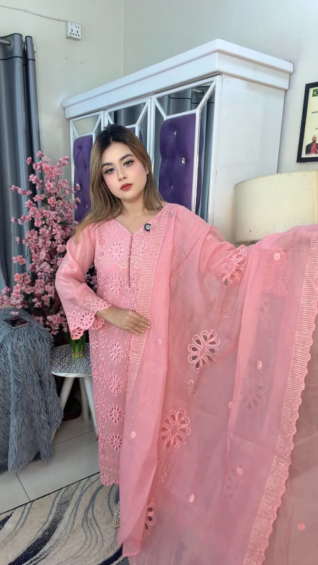 This Unstitched Four Piece Collection, beautifully crafted from soft organza fabric that offers a light, elegant, and premium feel. The outfit is adorned with fine boring embroidery work, giving it a sophisticated boutique-style finish.
