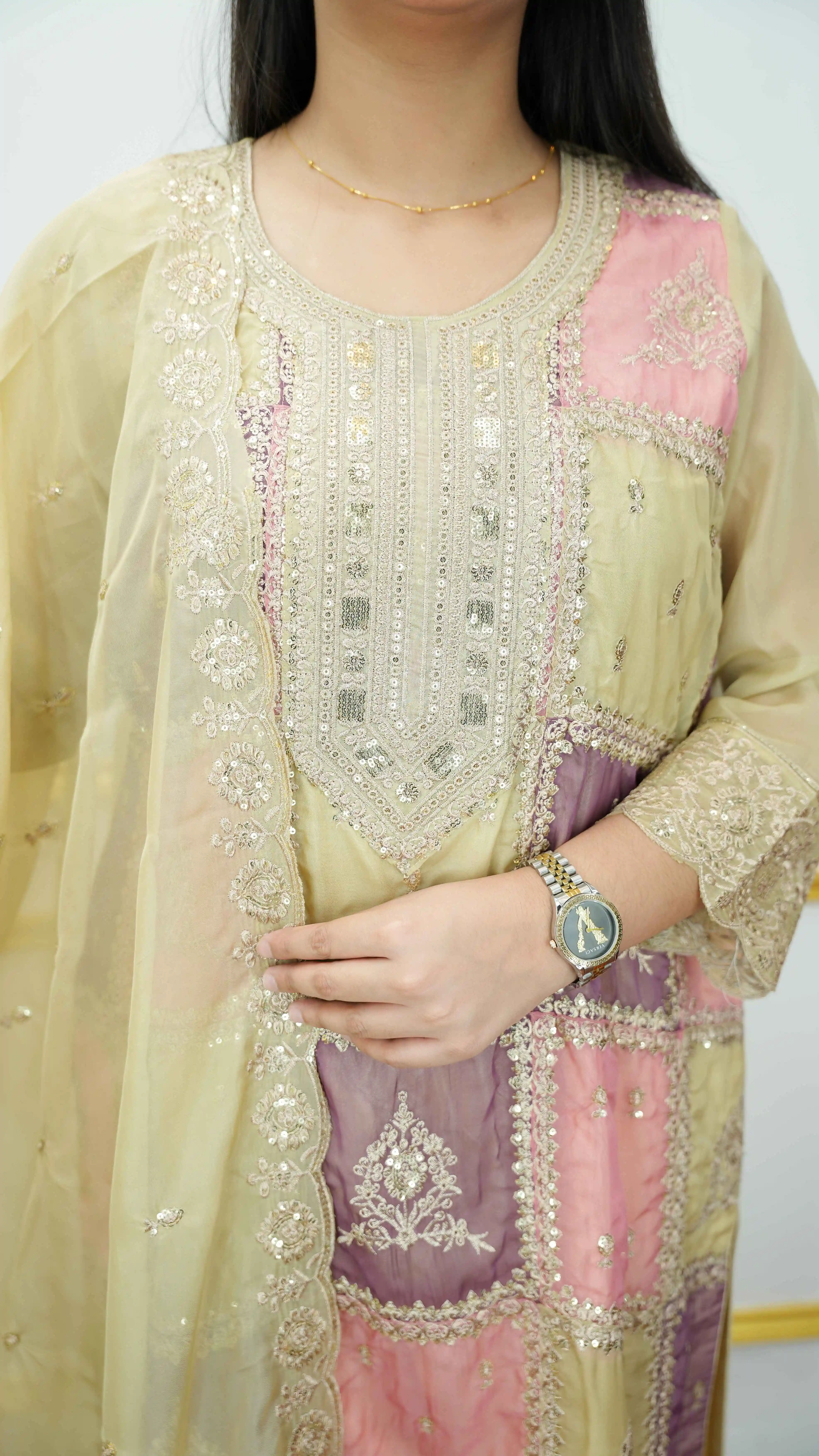 The design features rich ivory and antique gold embroidery complemented by multicolor patchwork panels, creating a visually striking and refined look. Heavily detailed vertical embroidery enhances the silhouette, while full-length sleeves with embroidered borders add a touch of regal elegance. The set is completed with a georgette dupatta adorned with embroidered motifs, elevating the overall appeal.