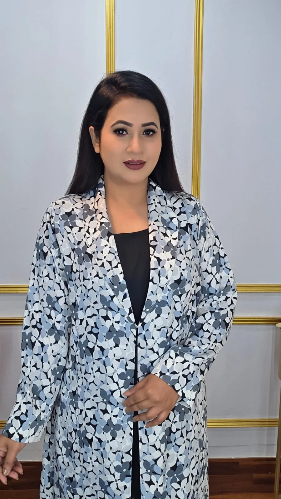This stylish Printed Co-Ord Set, designed for modern women who love effortless elegance. Crafted from luxury georgette fabric, this outfit features a printed pant, a chic blazer-style neckline, and a flowy shrug that adds a smart, layered look.