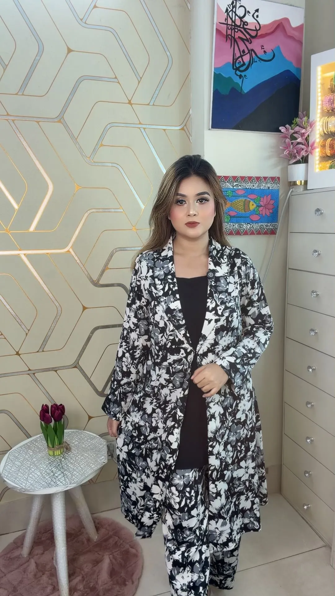Step into modern elegance with this Printed Co-Ord Set, beautifully designed using premium luxury crepe georgette fabric that offers a smooth drape and comfortable wear. The outfit features a stylish blazer-style neckline paired with a coordinated printed pant, creating a smart and contemporary look.