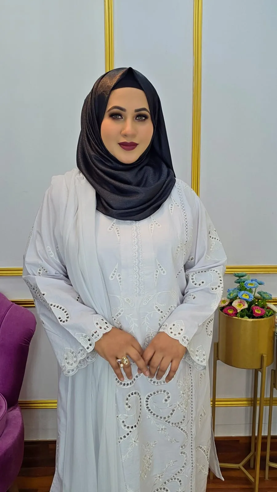 This Ready Three Piece Collection, crafted from soft and breathable pure cotton fabric for maximum comfort. The outfit features beautiful Chikankari (Chicken Kari) and boring embroidery work on the dress, creating a refined and graceful look.