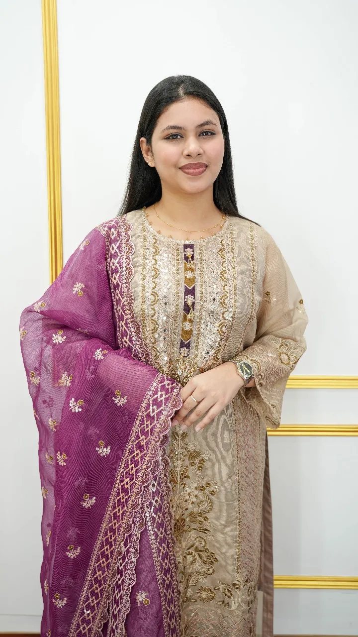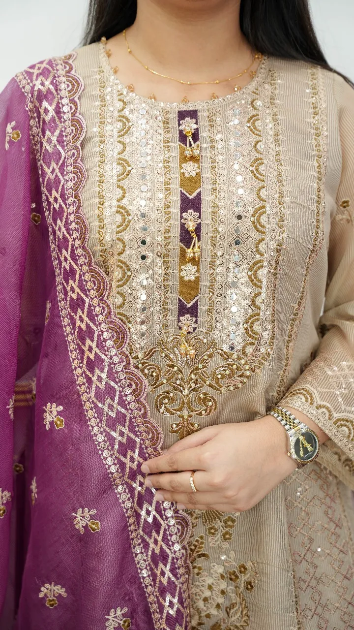 Step into sophistication with this exquisite Quota Maslin unstitched 4-piece set. Featuring delicate sequence and pearl embellishments, paired with a luxurious Turcel and an elegant orna, this set is designed for women who love to make a statement.