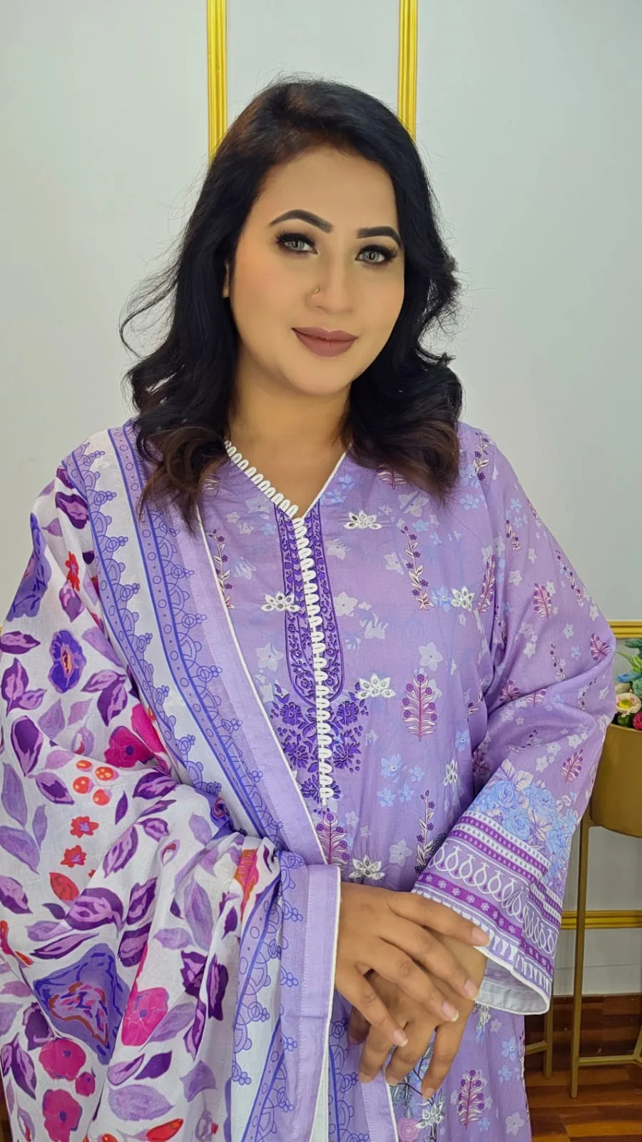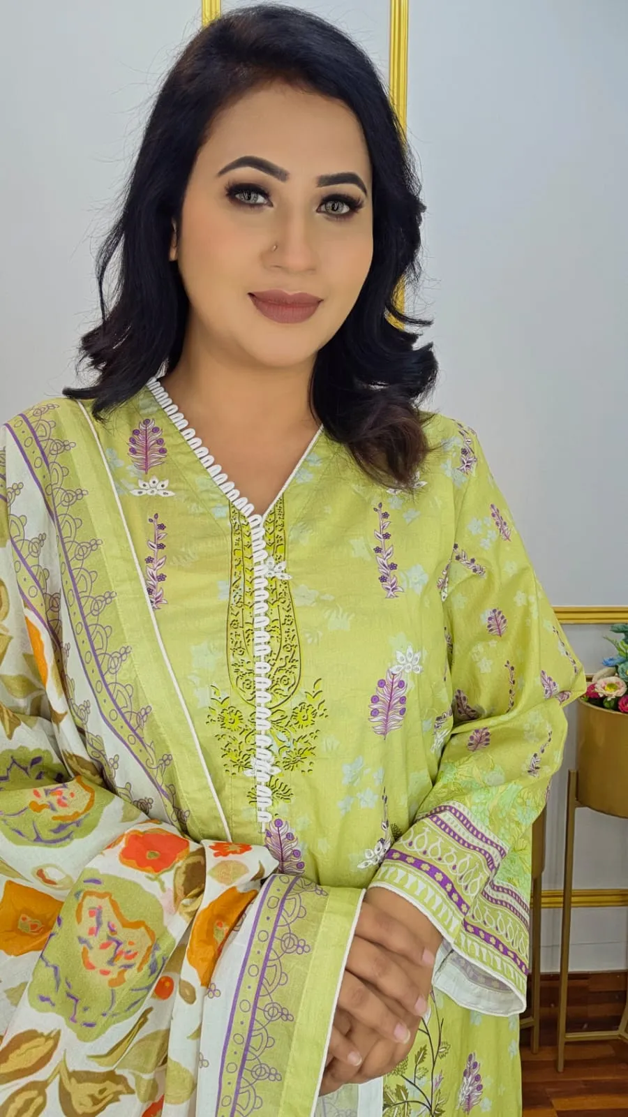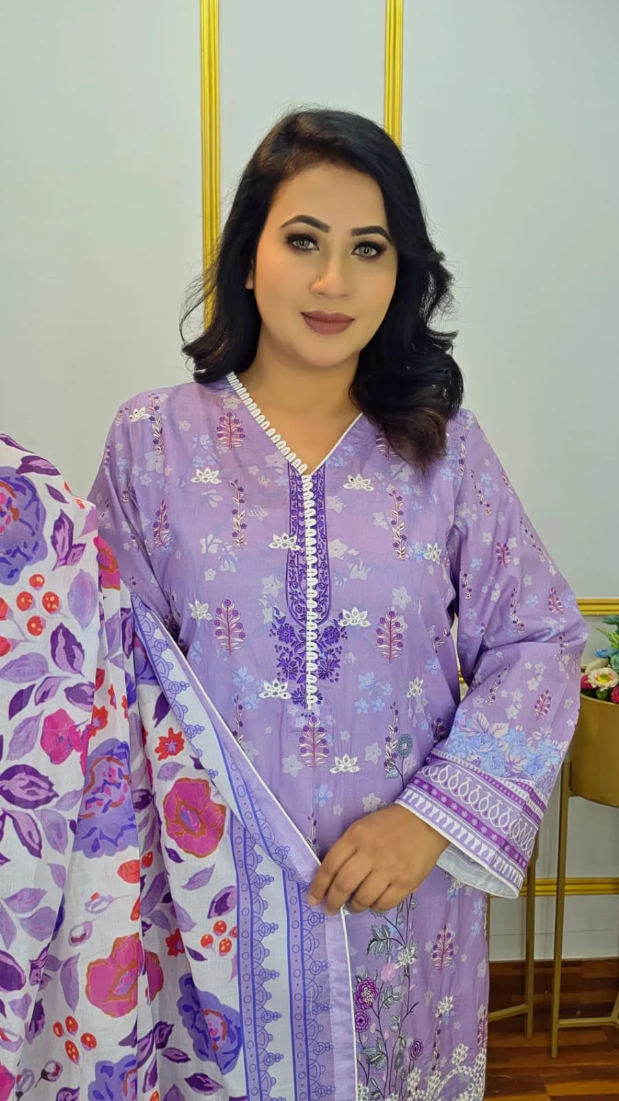 Experience pure cotton comfort with elegant style in this stunning ready three-piece suit featuring vibrant digital print and beautiful embroidery work. Crafted from 100% pure cotton with cord piping detail and full sleeves, this complete set is available in three gorgeous colors and ready to wear.