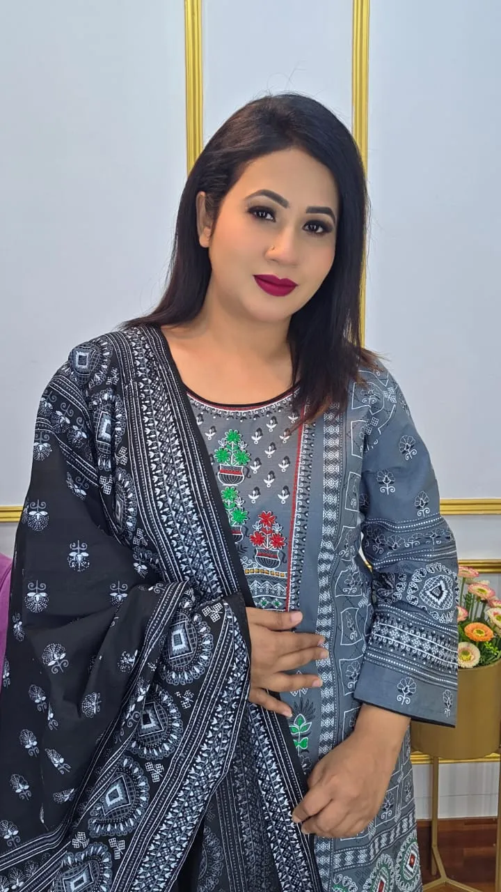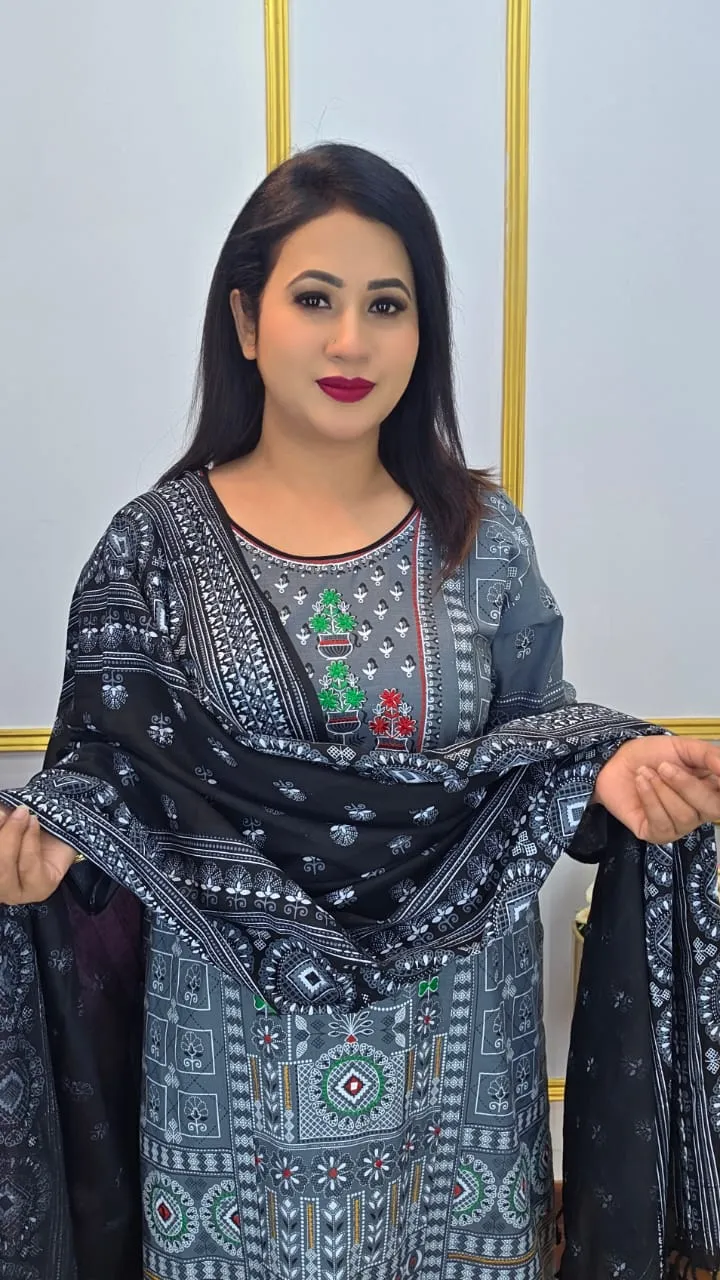 Discover the perfect harmony of comfort and style with this exquisite ready three-piece suit featuring geometric and ethnic block prints. Crafted from premium pure cotton with vibrant multicolor embroidered front panel, mirror work, and tassel dupatta, this complete set is ready to wear instantly.