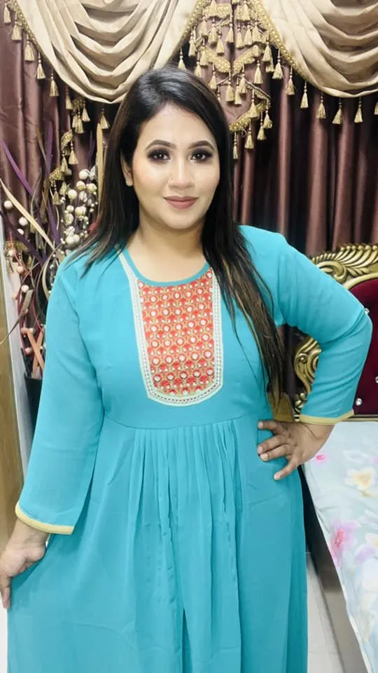 Elevate your style with this Semi Long Gown, crafted from soft and premium Jorjet fabric featuring delicate neck embroidery work. Designed for body sizes 34–48 with a length of 48 inches, this gown is perfect for parties, casual outings, and festive occasions.