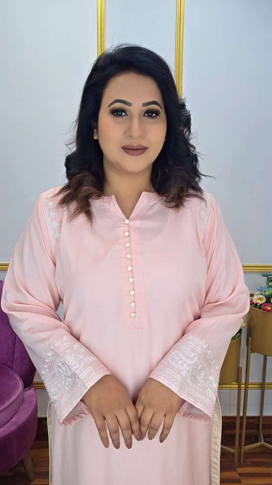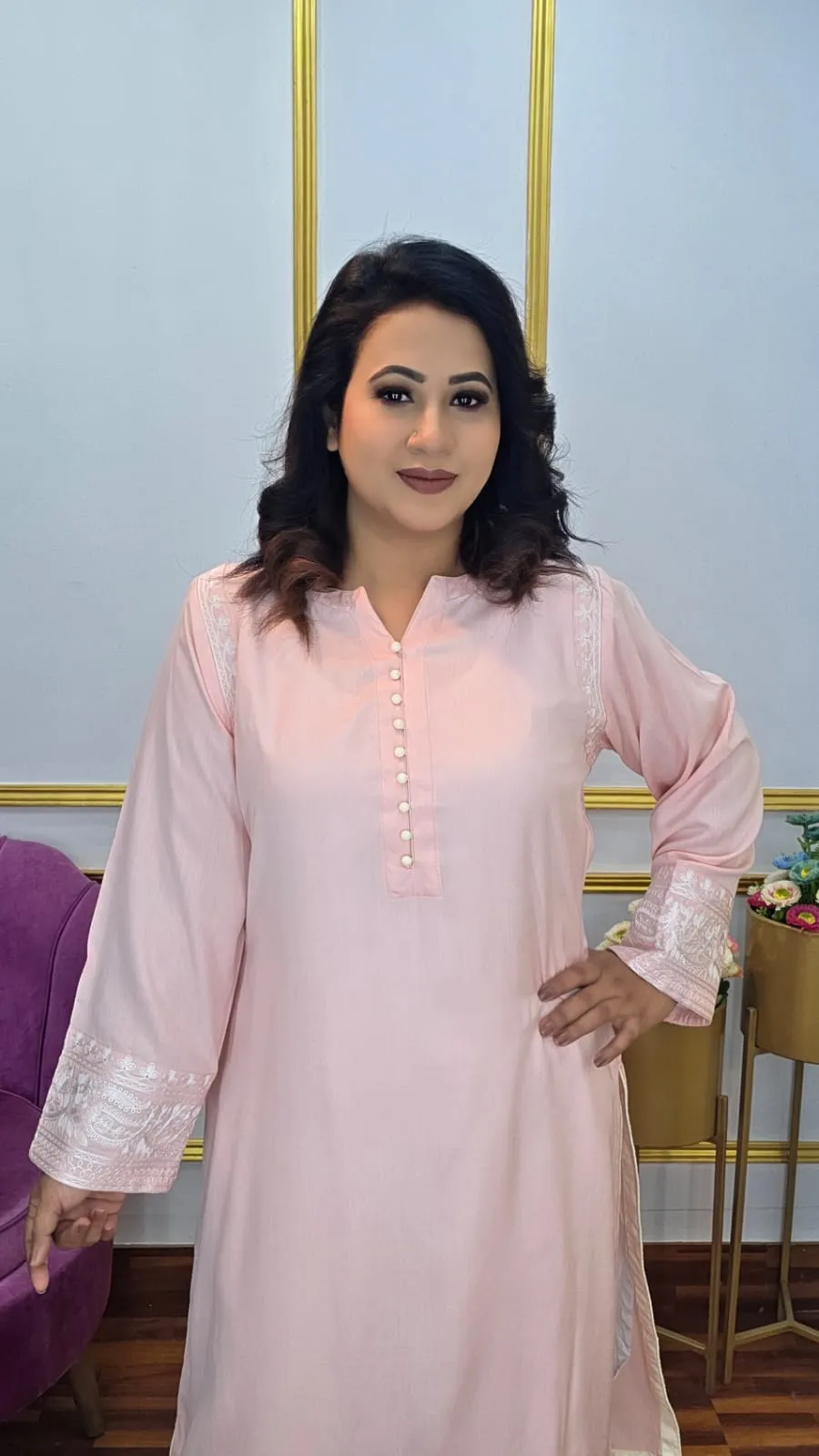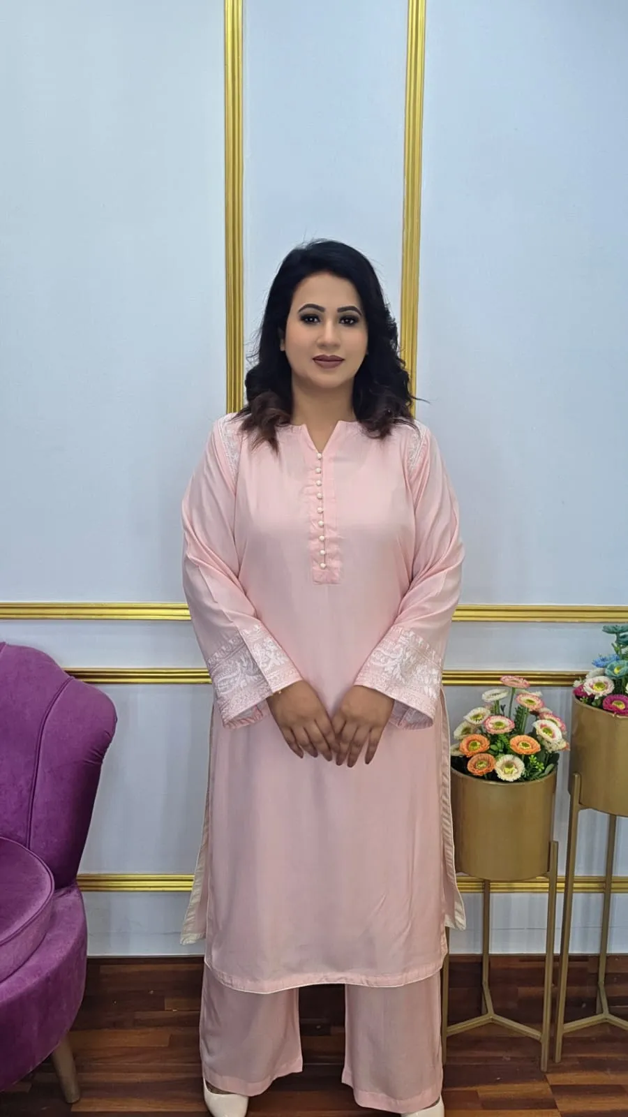 This elegant co-ords set crafted from premium imported linen featuring beautiful embroidery work and refined cord piping detail. This versatile two-piece outfit combines comfort with sophisticated style, perfect for creating effortlessly chic looks.