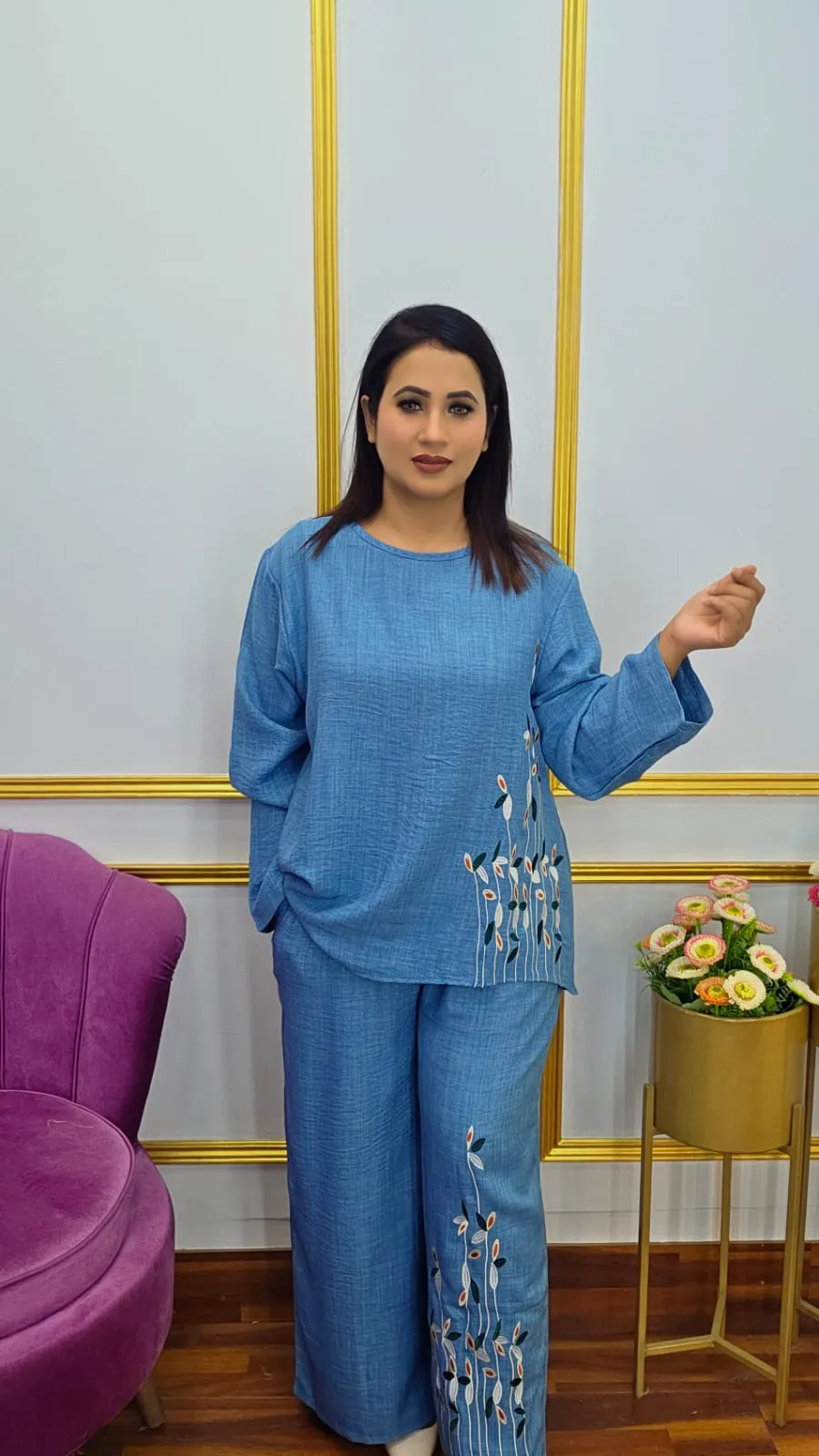 The set features beautiful embroidery work that adds a refined and fashionable touch, making it suitable for casual outings, office wear, or small gatherings. With a free-size body fit up to 46, it ensures a comfortable and flattering look for different body types.