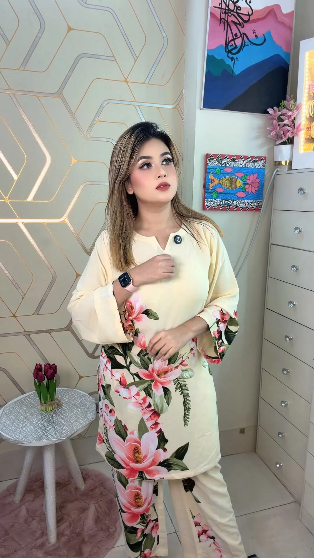 This elegant Co-Ord Set, crafted from soft malai georgette fabric for a lightweight, breathable, and comfortable feel. The outfit features a vibrant digital print and full sleeves, combining modern trends with classic charm.