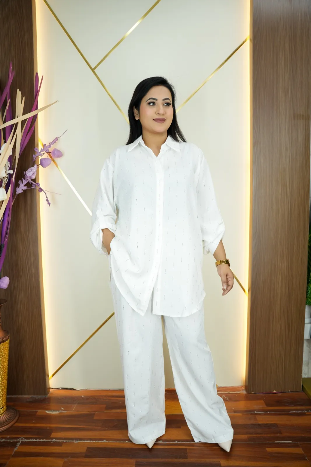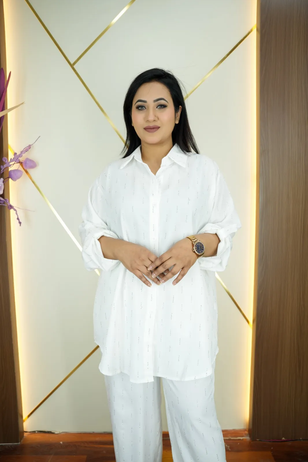 Stylish Imported Thai Co-Ord Set made from premium georgette fabric with elegant stone work. Features a classic shirt collar, full sleeves, and comfortable free-size fit up to 46. Comes with matching georgette pants with two side pockets—perfect for casual outings, office wear, or special occasions.