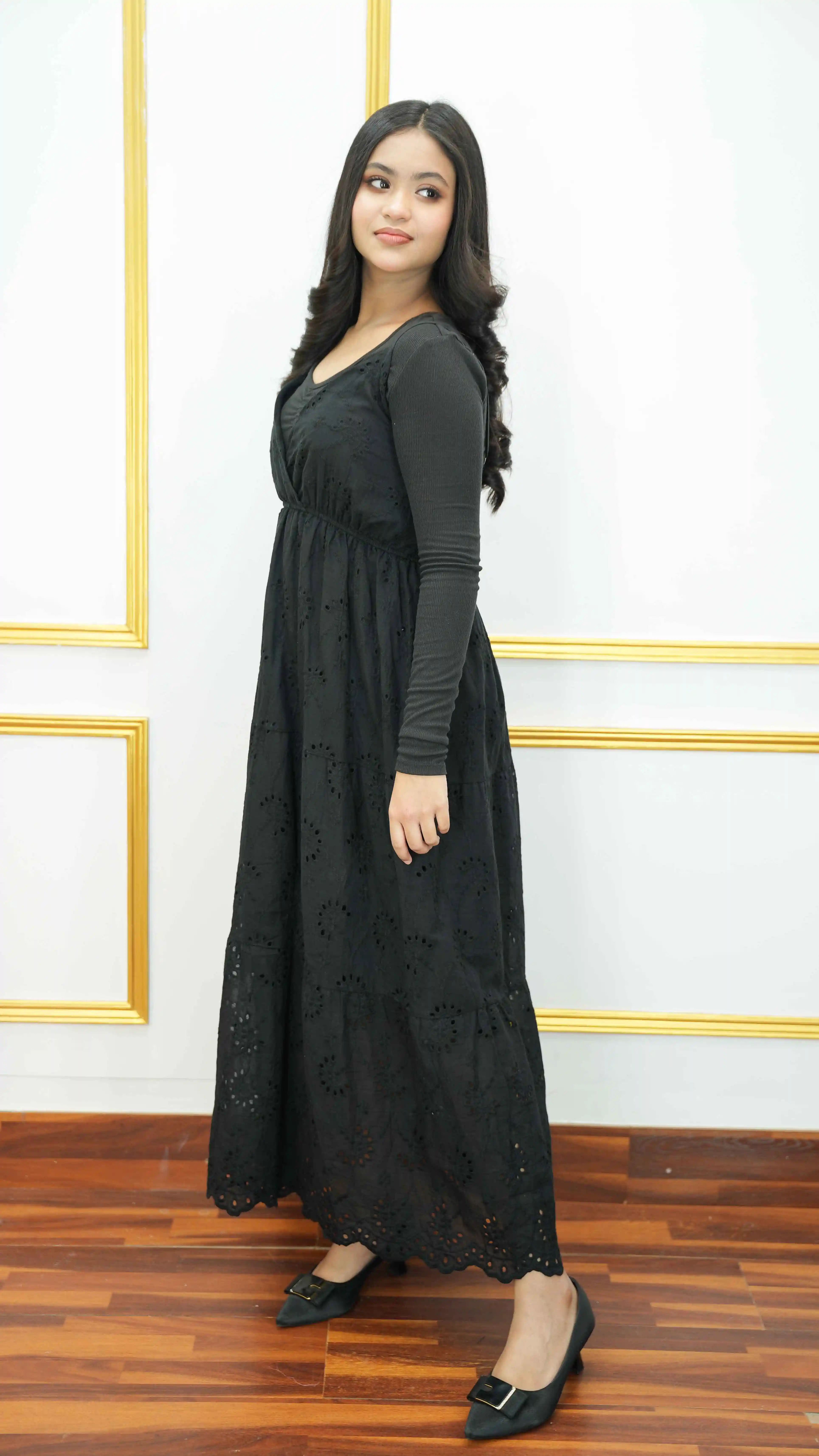 Thai Imported Cotton Eyelet Gown, a perfect blend of traditional craftsmanship and contemporary elegance. This stunning piece showcases the finest quality cotton eyelet fabric, imported directly from Thailand, featuring intricate all-over cutwork embroidery that creates a beautiful, airy aesthetic.