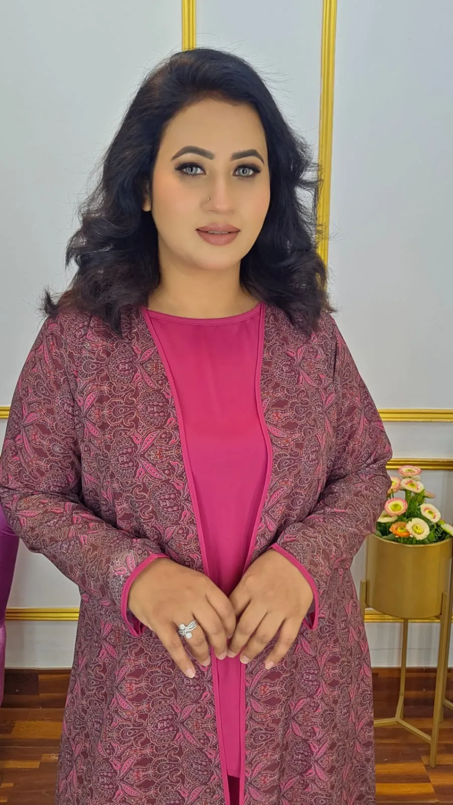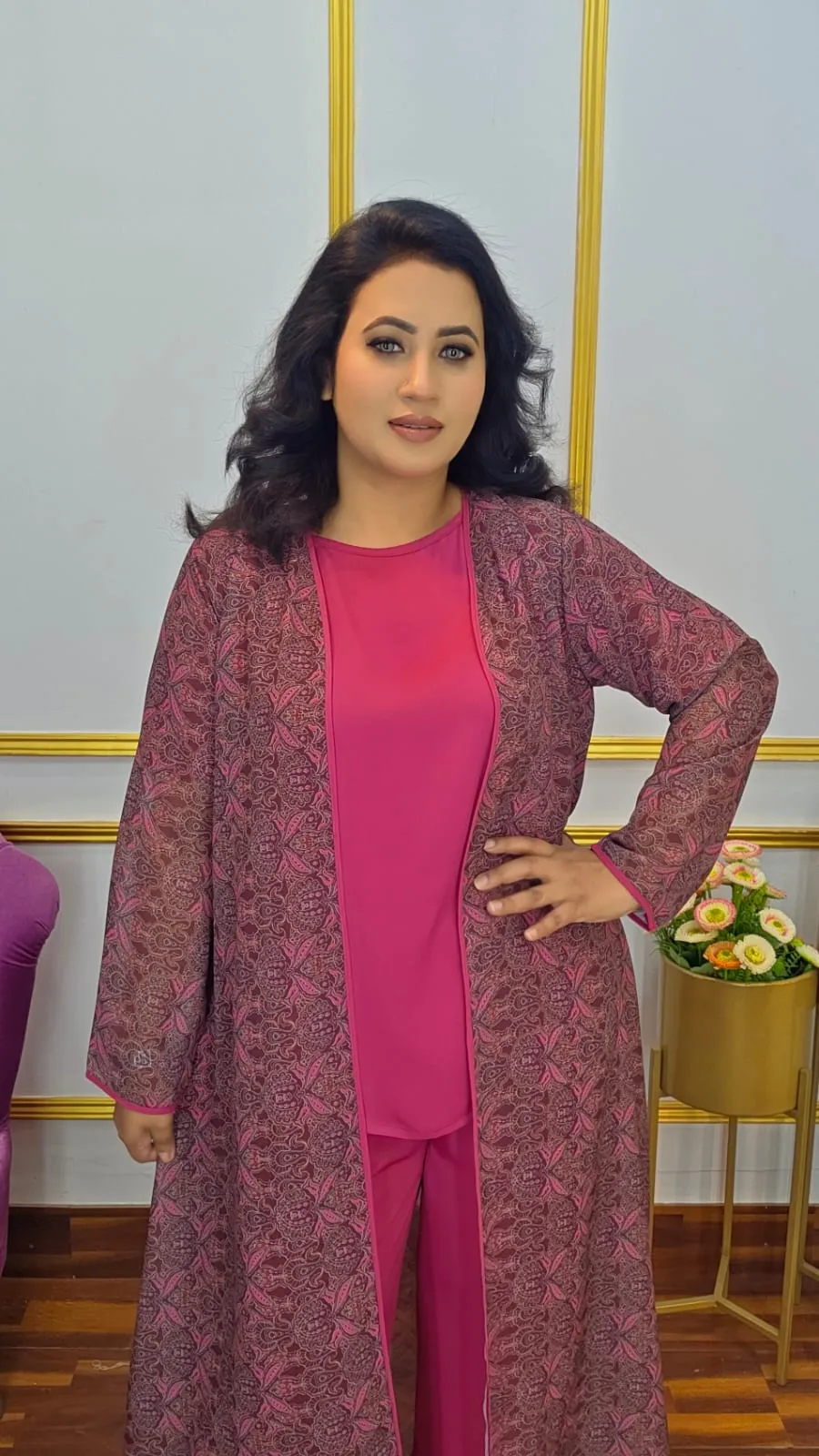 This elegant Three Part Co-Ord Set, crafted with premium fabrics for comfort and style. The inner and pant are made from Dubai Cherry, providing a soft, breathable fit, while the shrug is crafted from printed georgette, adding a trendy, vibrant touch.
